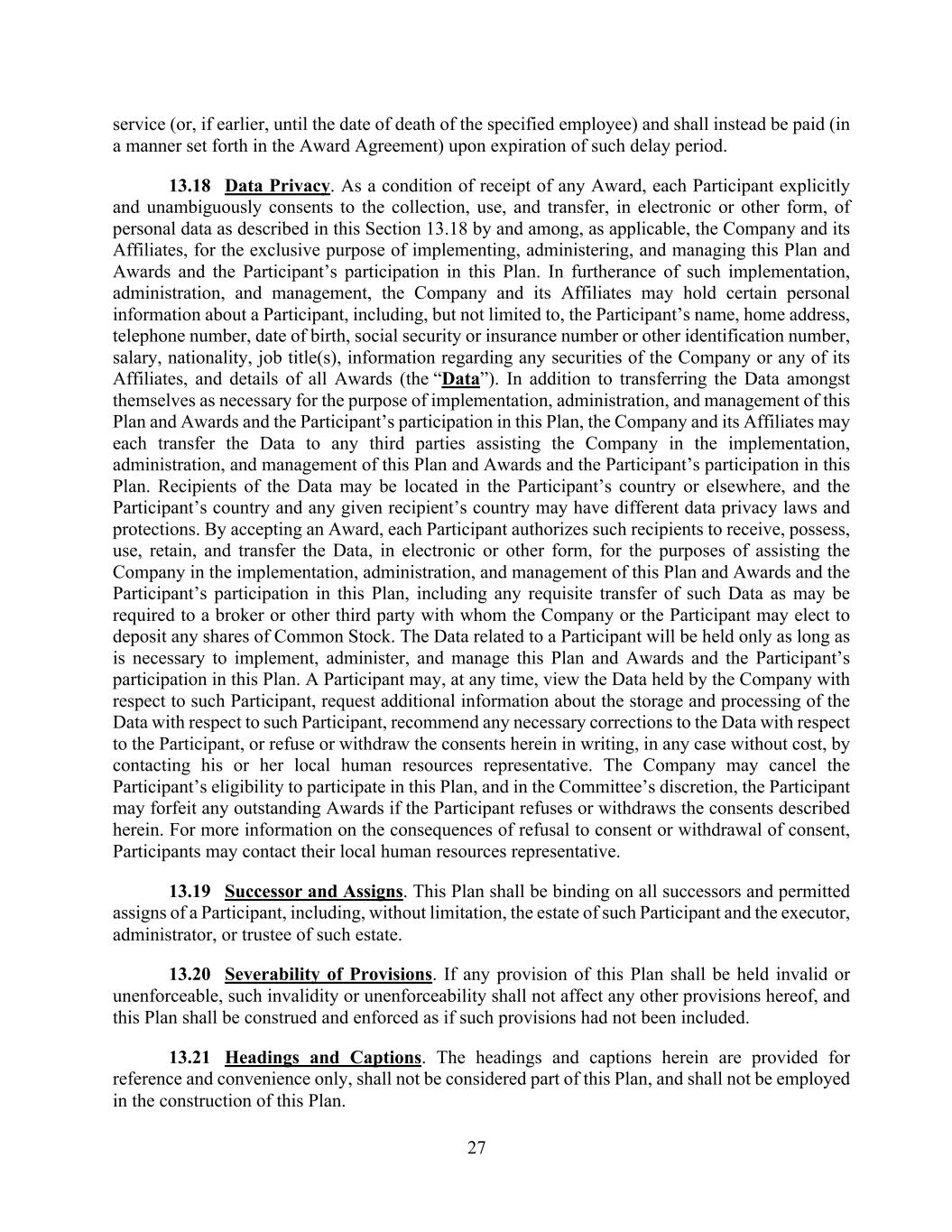 27 service (or, if earlier, until the date of death of the specified employee) and shall instead be paid (in a manner set forth in the Award Agreement) upon expiration of such delay period. 13.18 Data Privacy. As a condition of receipt of any Award, each Participant explicitly and unambiguously consents to the collection, use, and transfer, in electronic or other form, of personal data as described in this Section 13.18 by and among, as applicable, the Company and its Affiliates, for the exclusive purpose of implementing, administering, and managing this Plan and Awards and the Participant’s participation in this Plan. In furtherance of such implementation, administration, and management, the Company and its Affiliates may hold certain personal information about a Participant, including, but not limited to, the Participant’s name, home address, telephone number, date of birth, social security or insurance number or other identification number, salary, nationality, job title(s), information regarding any securities of the Company or any of its Affiliates, and details of all Awards (the “Data”). In addition to transferring the Data amongst themselves as necessary for the purpose of implementation, administration, and management of this Plan and Awards and the Participant’s participation in this Plan, the Company and its Affiliates may each transfer the Data to any third parties assisting the Company in the implementation, administration, and management of this Plan and Awards and the Participant’s participation in this Plan. Recipients of the Data may be located in the Participant’s country or elsewhere, and the Participant’s country and any given recipient’s country may have different data privacy laws and protections. By accepting an Award, each Participant authorizes such recipients to receive, possess, use, retain, and transfer the Data, in electronic or other form, for the purposes of assisting the Company in the implementation, administration, and management of this Plan and Awards and the Participant’s participation in this Plan, including any requisite transfer of such Data as may be required to a broker or other third party with whom the Company or the Participant may elect to deposit any shares of Common Stock. The Data related to a Participant will be held only as long as is necessary to implement, administer, and manage this Plan and Awards and the Participant’s participation in this Plan. A Participant may, at any time, view the Data held by the Company with respect to such Participant, request additional information about the storage and processing of the Data with respect to such Participant, recommend any necessary corrections to the Data with respect to the Participant, or refuse or withdraw the consents herein in writing, in any case without cost, by contacting his or her local human resources representative. The Company may cancel the Participant’s eligibility to participate in this Plan, and in the Committee’s discretion, the Participant may forfeit any outstanding Awards if the Participant refuses or withdraws the consents described herein. For more information on the consequences of refusal to consent or withdrawal of consent, Participants may contact their local human resources representative. 13.19 Successor and Assigns. This Plan shall be binding on all successors and permitted assigns of a Participant, including, without limitation, the estate of such Participant and the executor, administrator, or trustee of such estate. 13.20 Severability of Provisions. If any provision of this Plan shall be held invalid or unenforceable, such invalidity or unenforceability shall not affect any other provisions hereof, and this Plan shall be construed and enforced as if such provisions had not been included. 13.21 Headings and Captions. The headings and captions herein are provided for reference and convenience only, shall not be considered part of this Plan, and shall not be employed in the construction of this Plan.
