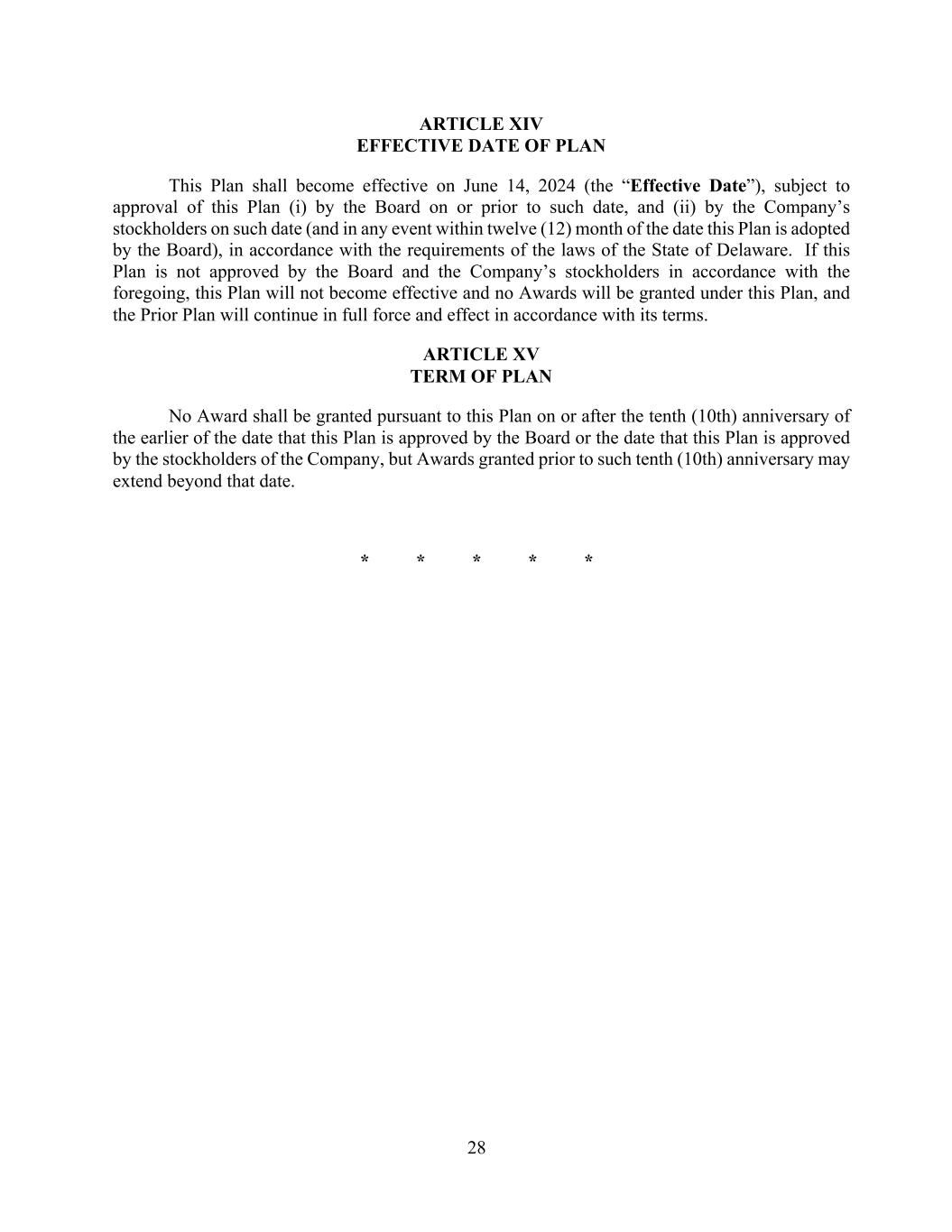 28 ARTICLE XIV EFFECTIVE DATE OF PLAN This Plan shall become effective on June 14, 2024 (the “Effective Date”), subject to approval of this Plan (i) by the Board on or prior to such date, and (ii) by the Company’s stockholders on such date (and in any event within twelve (12) month of the date this Plan is adopted by the Board), in accordance with the requirements of the laws of the State of Delaware. If this Plan is not approved by the Board and the Company’s stockholders in accordance with the foregoing, this Plan will not become effective and no Awards will be granted under this Plan, and the Prior Plan will continue in full force and effect in accordance with its terms. ARTICLE XV TERM OF PLAN No Award shall be granted pursuant to this Plan on or after the tenth (10th) anniversary of the earlier of the date that this Plan is approved by the Board or the date that this Plan is approved by the stockholders of the Company, but Awards granted prior to such tenth (10th) anniversary may extend beyond that date. * * * * *