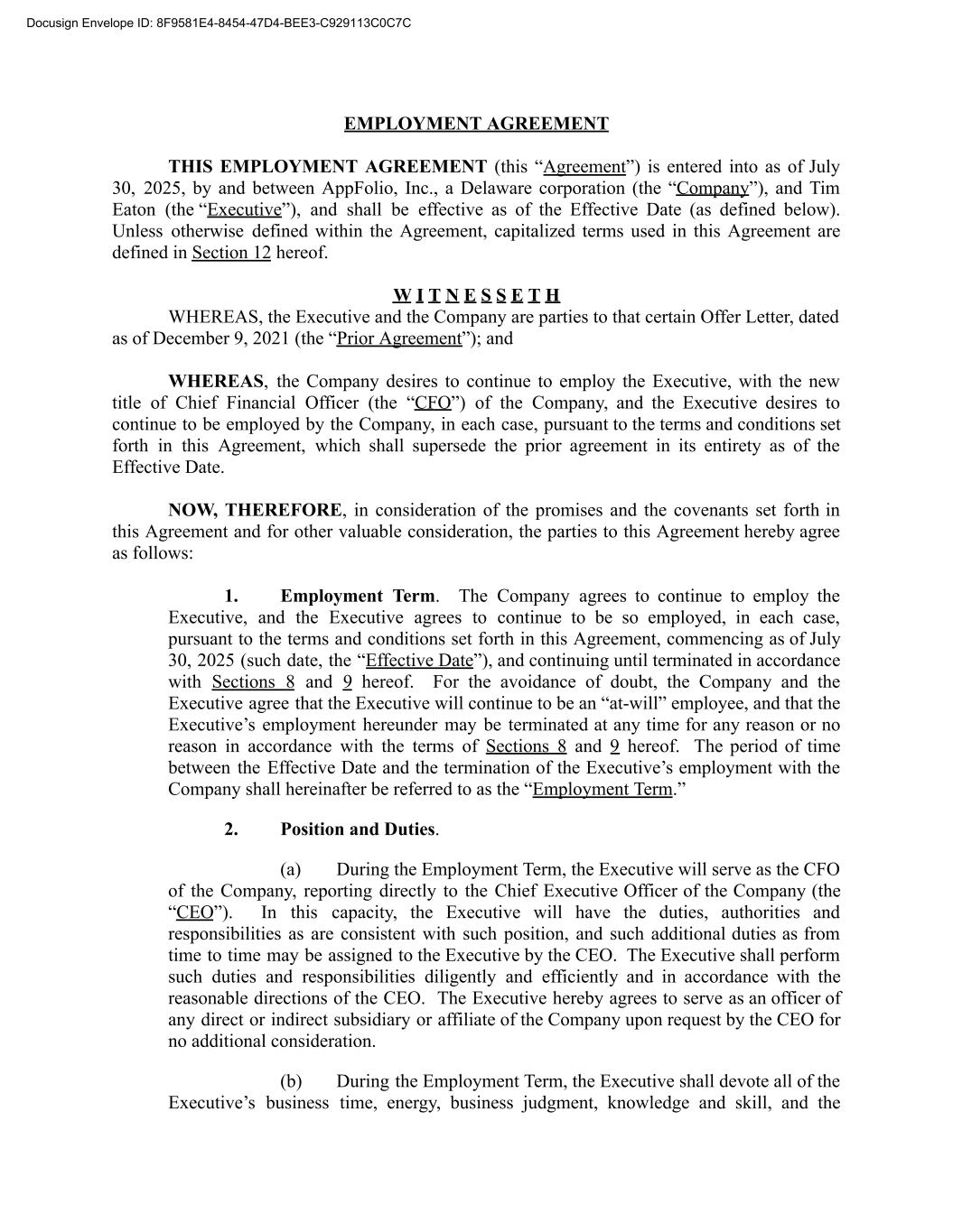 EMPLOYMENT AGREEMENT THIS EMPLOYMENT AGREEMENT (this “Agreement”) is entered into as of July 30, 2025, by and between AppFolio, Inc., a Delaware corporation (the “Company”), and Tim Eaton (the “Executive”), and shall be effective as of the Effective Date (as defined below). Unless otherwise defined within the Agreement, capitalized terms used in this Agreement are defined in Section 12 hereof. W I T N E S S E T H WHEREAS, the Executive and the Company are parties to that certain Offer Letter, dated as of December 9, 2021 (the “Prior Agreement”); and WHEREAS, the Company desires to continue to employ the Executive, with the new title of Chief Financial Officer (the “CFO”) of the Company, and the Executive desires to continue to be employed by the Company, in each case, pursuant to the terms and conditions set forth in this Agreement, which shall supersede the prior agreement in its entirety as of the Effective Date. NOW, THEREFORE, in consideration of the promises and the covenants set forth in this Agreement and for other valuable consideration, the parties to this Agreement hereby agree as follows: 1. Employment Term. The Company agrees to continue to employ the Executive, and the Executive agrees to continue to be so employed, in each case, pursuant to the terms and conditions set forth in this Agreement, commencing as of July 30, 2025 (such date, the “Effective Date”), and continuing until terminated in accordance with Sections 8 and 9 hereof. For the avoidance of doubt, the Company and the Executive agree that the Executive will continue to be an “at-will” employee, and that the Executive’s employment hereunder may be terminated at any time for any reason or no reason in accordance with the terms of Sections 8 and 9 hereof. The period of time between the Effective Date and the termination of the Executive’s employment with the Company shall hereinafter be referred to as the “Employment Term.” 2. Position and Duties. (a) During the Employment Term, the Executive will serve as the CFO of the Company, reporting directly to the Chief Executive Officer of the Company (the “CEO”). In this capacity, the Executive will have the duties, authorities and responsibilities as are consistent with such position, and such additional duties as from time to time may be assigned to the Executive by the CEO. The Executive shall perform such duties and responsibilities diligently and efficiently and in accordance with the reasonable directions of the CEO. The Executive hereby agrees to serve as an officer of any direct or indirect subsidiary or affiliate of the Company upon request by the CEO for no additional consideration. (b) During the Employment Term, the Executive shall devote all of the Executive’s business time, energy, business judgment, knowledge and skill, and the Docusign Envelope ID: 8F9581E4-8454-47D4-BEE3-C929113C0C7C