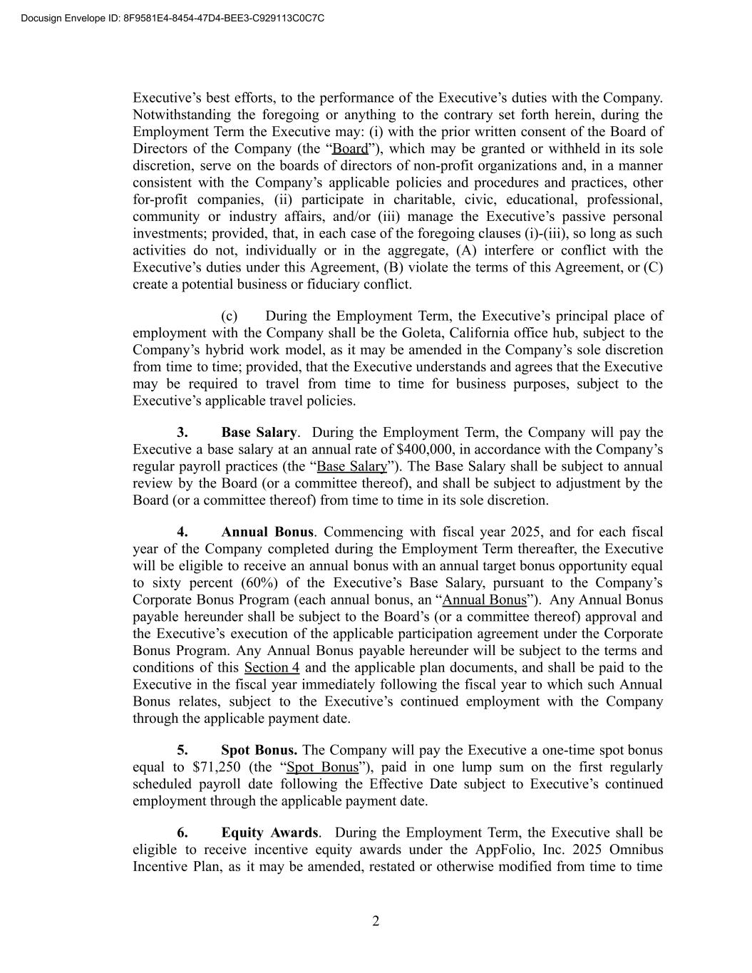 Executive’s best efforts, to the performance of the Executive’s duties with the Company. Notwithstanding the foregoing or anything to the contrary set forth herein, during the Employment Term the Executive may: (i) with the prior written consent of the Board of Directors of the Company (the “Board”), which may be granted or withheld in its sole discretion, serve on the boards of directors of non-profit organizations and, in a manner consistent with the Company’s applicable policies and procedures and practices, other for-profit companies, (ii) participate in charitable, civic, educational, professional, community or industry affairs, and/or (iii) manage the Executive’s passive personal investments; provided, that, in each case of the foregoing clauses (i)-(iii), so long as such activities do not, individually or in the aggregate, (A) interfere or conflict with the Executive’s duties under this Agreement, (B) violate the terms of this Agreement, or (C) create a potential business or fiduciary conflict. (c) During the Employment Term, the Executive’s principal place of employment with the Company shall be the Goleta, California office hub, subject to the Company’s hybrid work model, as it may be amended in the Company’s sole discretion from time to time; provided, that the Executive understands and agrees that the Executive may be required to travel from time to time for business purposes, subject to the Executive’s applicable travel policies. 3. Base Salary. During the Employment Term, the Company will pay the Executive a base salary at an annual rate of $400,000, in accordance with the Company’s regular payroll practices (the “Base Salary”). The Base Salary shall be subject to annual review by the Board (or a committee thereof), and shall be subject to adjustment by the Board (or a committee thereof) from time to time in its sole discretion. 4. Annual Bonus. Commencing with fiscal year 2025, and for each fiscal year of the Company completed during the Employment Term thereafter, the Executive will be eligible to receive an annual bonus with an annual target bonus opportunity equal to sixty percent (60%) of the Executive’s Base Salary, pursuant to the Company’s Corporate Bonus Program (each annual bonus, an “Annual Bonus”). Any Annual Bonus payable hereunder shall be subject to the Board’s (or a committee thereof) approval and the Executive’s execution of the applicable participation agreement under the Corporate Bonus Program. Any Annual Bonus payable hereunder will be subject to the terms and conditions of this Section 4 and the applicable plan documents, and shall be paid to the Executive in the fiscal year immediately following the fiscal year to which such Annual Bonus relates, subject to the Executive’s continued employment with the Company through the applicable payment date. 5. Spot Bonus. The Company will pay the Executive a one-time spot bonus equal to $71,250 (the “Spot Bonus”), paid in one lump sum on the first regularly scheduled payroll date following the Effective Date subject to Executive’s continued employment through the applicable payment date. 6. Equity Awards. During the Employment Term, the Executive shall be eligible to receive incentive equity awards under the AppFolio, Inc. 2025 Omnibus Incentive Plan, as it may be amended, restated or otherwise modified from time to time 2 Docusign Envelope ID: 8F9581E4-8454-47D4-BEE3-C929113C0C7C