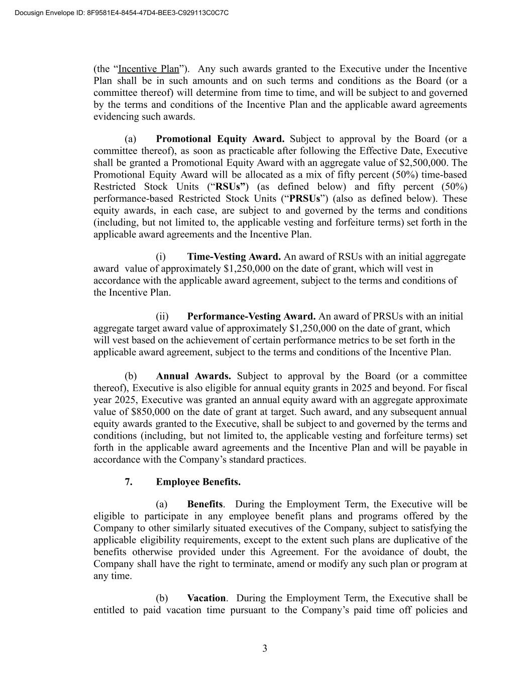 (the “Incentive Plan”). Any such awards granted to the Executive under the Incentive Plan shall be in such amounts and on such terms and conditions as the Board (or a committee thereof) will determine from time to time, and will be subject to and governed by the terms and conditions of the Incentive Plan and the applicable award agreements evidencing such awards. (a) Promotional Equity Award. Subject to approval by the Board (or a committee thereof), as soon as practicable after following the Effective Date, Executive shall be granted a Promotional Equity Award with an aggregate value of $2,500,000. The Promotional Equity Award will be allocated as a mix of fifty percent (50%) time-based Restricted Stock Units (“RSUs”) (as defined below) and fifty percent (50%) performance-based Restricted Stock Units (“PRSUs”) (also as defined below). These equity awards, in each case, are subject to and governed by the terms and conditions (including, but not limited to, the applicable vesting and forfeiture terms) set forth in the applicable award agreements and the Incentive Plan. (i) Time-Vesting Award. An award of RSUs with an initial aggregate award value of approximately $1,250,000 on the date of grant, which will vest in accordance with the applicable award agreement, subject to the terms and conditions of the Incentive Plan. (ii) Performance-Vesting Award. An award of PRSUs with an initial aggregate target award value of approximately $1,250,000 on the date of grant, which will vest based on the achievement of certain performance metrics to be set forth in the applicable award agreement, subject to the terms and conditions of the Incentive Plan. (b) Annual Awards. Subject to approval by the Board (or a committee thereof), Executive is also eligible for annual equity grants in 2025 and beyond. For fiscal year 2025, Executive was granted an annual equity award with an aggregate approximate value of $850,000 on the date of grant at target. Such award, and any subsequent annual equity awards granted to the Executive, shall be subject to and governed by the terms and conditions (including, but not limited to, the applicable vesting and forfeiture terms) set forth in the applicable award agreements and the Incentive Plan and will be payable in accordance with the Company’s standard practices. 7. Employee Benefits. (a) Benefits. During the Employment Term, the Executive will be eligible to participate in any employee benefit plans and programs offered by the Company to other similarly situated executives of the Company, subject to satisfying the applicable eligibility requirements, except to the extent such plans are duplicative of the benefits otherwise provided under this Agreement. For the avoidance of doubt, the Company shall have the right to terminate, amend or modify any such plan or program at any time. (b) Vacation. During the Employment Term, the Executive shall be entitled to paid vacation time pursuant to the Company’s paid time off policies and 3 Docusign Envelope ID: 8F9581E4-8454-47D4-BEE3-C929113C0C7C