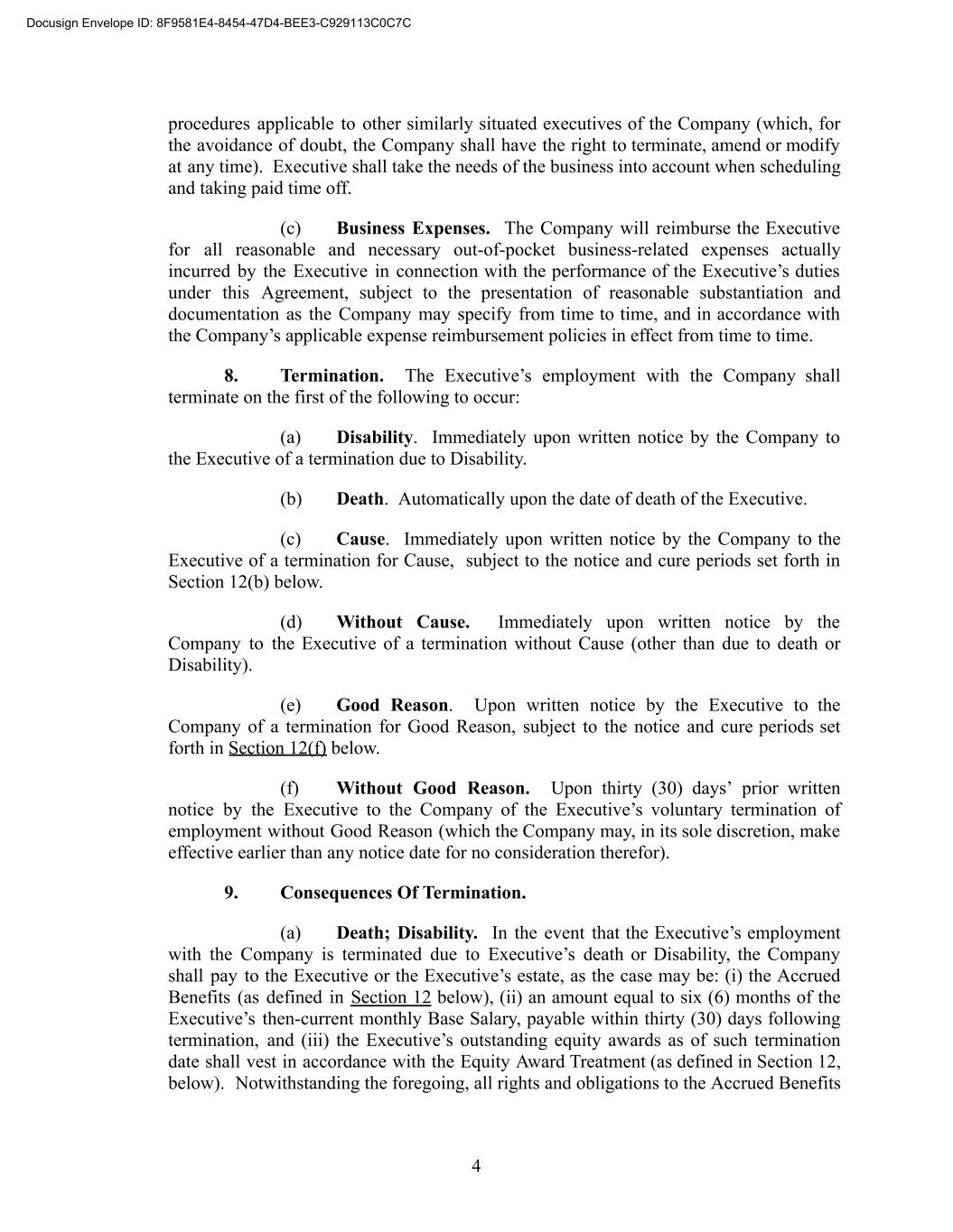 procedures applicable to other similarly situated executives of the Company (which, for the avoidance of doubt, the Company shall have the right to terminate, amend or modify at any time). Executive shall take the needs of the business into account when scheduling and taking paid time off. (c) Business Expenses. The Company will reimburse the Executive for all reasonable and necessary out-of-pocket business-related expenses actually incurred by the Executive in connection with the performance of the Executive’s duties under this Agreement, subject to the presentation of reasonable substantiation and documentation as the Company may specify from time to time, and in accordance with the Company’s applicable expense reimbursement policies in effect from time to time. 8. Termination. The Executive’s employment with the Company shall terminate on the first of the following to occur: (a) Disability. Immediately upon written notice by the Company to the Executive of a termination due to Disability. (b) Death. Automatically upon the date of death of the Executive. (c) Cause. Immediately upon written notice by the Company to the Executive of a termination for Cause, subject to the notice and cure periods set forth in Section 12(b) below. (d) Without Cause. Immediately upon written notice by the Company to the Executive of a termination without Cause (other than due to death or Disability). (e) Good Reason. Upon written notice by the Executive to the Company of a termination for Good Reason, subject to the notice and cure periods set forth in Section 12(f) below. (f) Without Good Reason. Upon thirty (30) days’ prior written notice by the Executive to the Company of the Executive’s voluntary termination of employment without Good Reason (which the Company may, in its sole discretion, make effective earlier than any notice date for no consideration therefor). 9. Consequences Of Termination. (a) Death; Disability. In the event that the Executive’s employment with the Company is terminated due to Executive’s death or Disability, the Company shall pay to the Executive or the Executive’s estate, as the case may be: (i) the Accrued Benefits (as defined in Section 12 below), (ii) an amount equal to six (6) months of the Executive’s then-current monthly Base Salary, payable within thirty (30) days following termination, and (iii) the Executive’s outstanding equity awards as of such termination date shall vest in accordance with the Equity Award Treatment (as defined in Section 12, below). Notwithstanding the foregoing, all rights and obligations to the Accrued Benefits 4 Docusign Envelope ID: 8F9581E4-8454-47D4-BEE3-C929113C0C7C