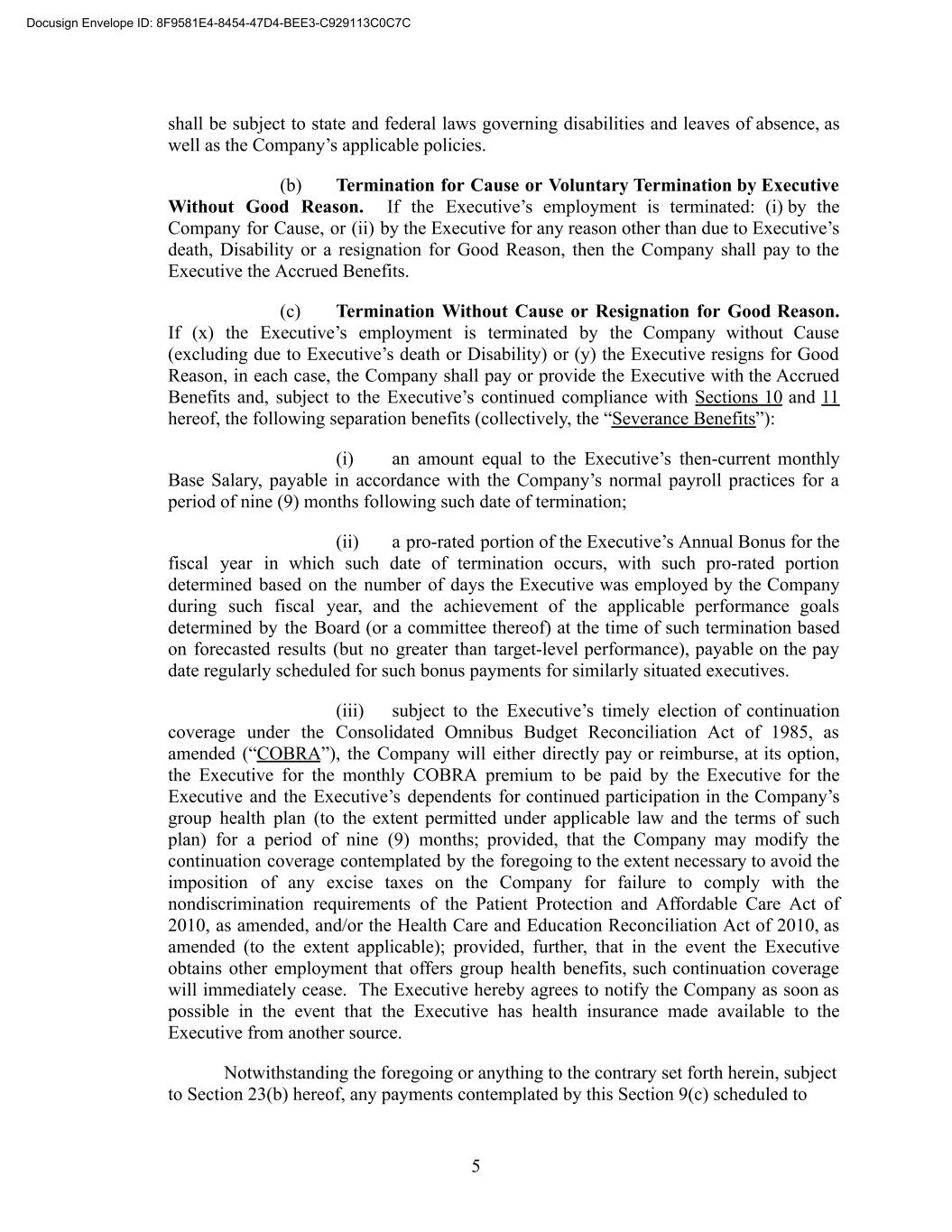 shall be subject to state and federal laws governing disabilities and leaves of absence, as well as the Company’s applicable policies. (b) Termination for Cause or Voluntary Termination by Executive Without Good Reason. If the Executive’s employment is terminated: (i) by the Company for Cause, or (ii) by the Executive for any reason other than due to Executive’s death, Disability or a resignation for Good Reason, then the Company shall pay to the Executive the Accrued Benefits. (c) Termination Without Cause or Resignation for Good Reason. If (x) the Executive’s employment is terminated by the Company without Cause (excluding due to Executive’s death or Disability) or (y) the Executive resigns for Good Reason, in each case, the Company shall pay or provide the Executive with the Accrued Benefits and, subject to the Executive’s continued compliance with Sections 10 and 11 hereof, the following separation benefits (collectively, the “Severance Benefits”): (i) an amount equal to the Executive’s then-current monthly Base Salary, payable in accordance with the Company’s normal payroll practices for a period of nine (9) months following such date of termination; (ii) a pro-rated portion of the Executive’s Annual Bonus for the fiscal year in which such date of termination occurs, with such pro-rated portion determined based on the number of days the Executive was employed by the Company during such fiscal year, and the achievement of the applicable performance goals determined by the Board (or a committee thereof) at the time of such termination based on forecasted results (but no greater than target-level performance), payable on the pay date regularly scheduled for such bonus payments for similarly situated executives. (iii) subject to the Executive’s timely election of continuation coverage under the Consolidated Omnibus Budget Reconciliation Act of 1985, as amended (“COBRA”), the Company will either directly pay or reimburse, at its option, the Executive for the monthly COBRA premium to be paid by the Executive for the Executive and the Executive’s dependents for continued participation in the Company’s group health plan (to the extent permitted under applicable law and the terms of such plan) for a period of nine (9) months; provided, that the Company may modify the continuation coverage contemplated by the foregoing to the extent necessary to avoid the imposition of any excise taxes on the Company for failure to comply with the nondiscrimination requirements of the Patient Protection and Affordable Care Act of 2010, as amended, and/or the Health Care and Education Reconciliation Act of 2010, as amended (to the extent applicable); provided, further, that in the event the Executive obtains other employment that offers group health benefits, such continuation coverage will immediately cease. The Executive hereby agrees to notify the Company as soon as possible in the event that the Executive has health insurance made available to the Executive from another source. Notwithstanding the foregoing or anything to the contrary set forth herein, subject to Section 23(b) hereof, any payments contemplated by this Section 9(c) scheduled to 5 Docusign Envelope ID: 8F9581E4-8454-47D4-BEE3-C929113C0C7C