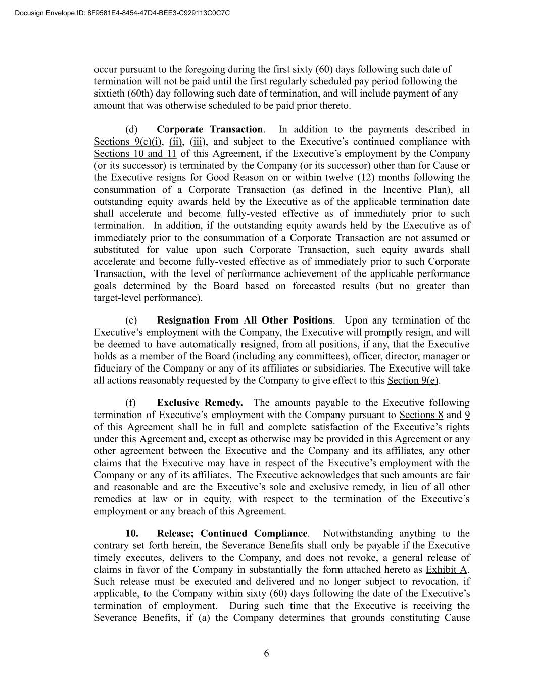 occur pursuant to the foregoing during the first sixty (60) days following such date of termination will not be paid until the first regularly scheduled pay period following the sixtieth (60th) day following such date of termination, and will include payment of any amount that was otherwise scheduled to be paid prior thereto. (d) Corporate Transaction. In addition to the payments described in Sections 9(c)(i), (ii), (iii), and subject to the Executive’s continued compliance with Sections 10 and 11 of this Agreement, if the Executive’s employment by the Company (or its successor) is terminated by the Company (or its successor) other than for Cause or the Executive resigns for Good Reason on or within twelve (12) months following the consummation of a Corporate Transaction (as defined in the Incentive Plan), all outstanding equity awards held by the Executive as of the applicable termination date shall accelerate and become fully-vested effective as of immediately prior to such termination. In addition, if the outstanding equity awards held by the Executive as of immediately prior to the consummation of a Corporate Transaction are not assumed or substituted for value upon such Corporate Transaction, such equity awards shall accelerate and become fully-vested effective as of immediately prior to such Corporate Transaction, with the level of performance achievement of the applicable performance goals determined by the Board based on forecasted results (but no greater than target-level performance). (e) Resignation From All Other Positions. Upon any termination of the Executive’s employment with the Company, the Executive will promptly resign, and will be deemed to have automatically resigned, from all positions, if any, that the Executive holds as a member of the Board (including any committees), officer, director, manager or fiduciary of the Company or any of its affiliates or subsidiaries. The Executive will take all actions reasonably requested by the Company to give effect to this Section 9(e). (f) Exclusive Remedy. The amounts payable to the Executive following termination of Executive’s employment with the Company pursuant to Sections 8 and 9 of this Agreement shall be in full and complete satisfaction of the Executive’s rights under this Agreement and, except as otherwise may be provided in this Agreement or any other agreement between the Executive and the Company and its affiliates, any other claims that the Executive may have in respect of the Executive’s employment with the Company or any of its affiliates. The Executive acknowledges that such amounts are fair and reasonable and are the Executive’s sole and exclusive remedy, in lieu of all other remedies at law or in equity, with respect to the termination of the Executive’s employment or any breach of this Agreement. 10. Release; Continued Compliance. Notwithstanding anything to the contrary set forth herein, the Severance Benefits shall only be payable if the Executive timely executes, delivers to the Company, and does not revoke, a general release of claims in favor of the Company in substantially the form attached hereto as Exhibit A. Such release must be executed and delivered and no longer subject to revocation, if applicable, to the Company within sixty (60) days following the date of the Executive’s termination of employment. During such time that the Executive is receiving the Severance Benefits, if (a) the Company determines that grounds constituting Cause 6 Docusign Envelope ID: 8F9581E4-8454-47D4-BEE3-C929113C0C7C