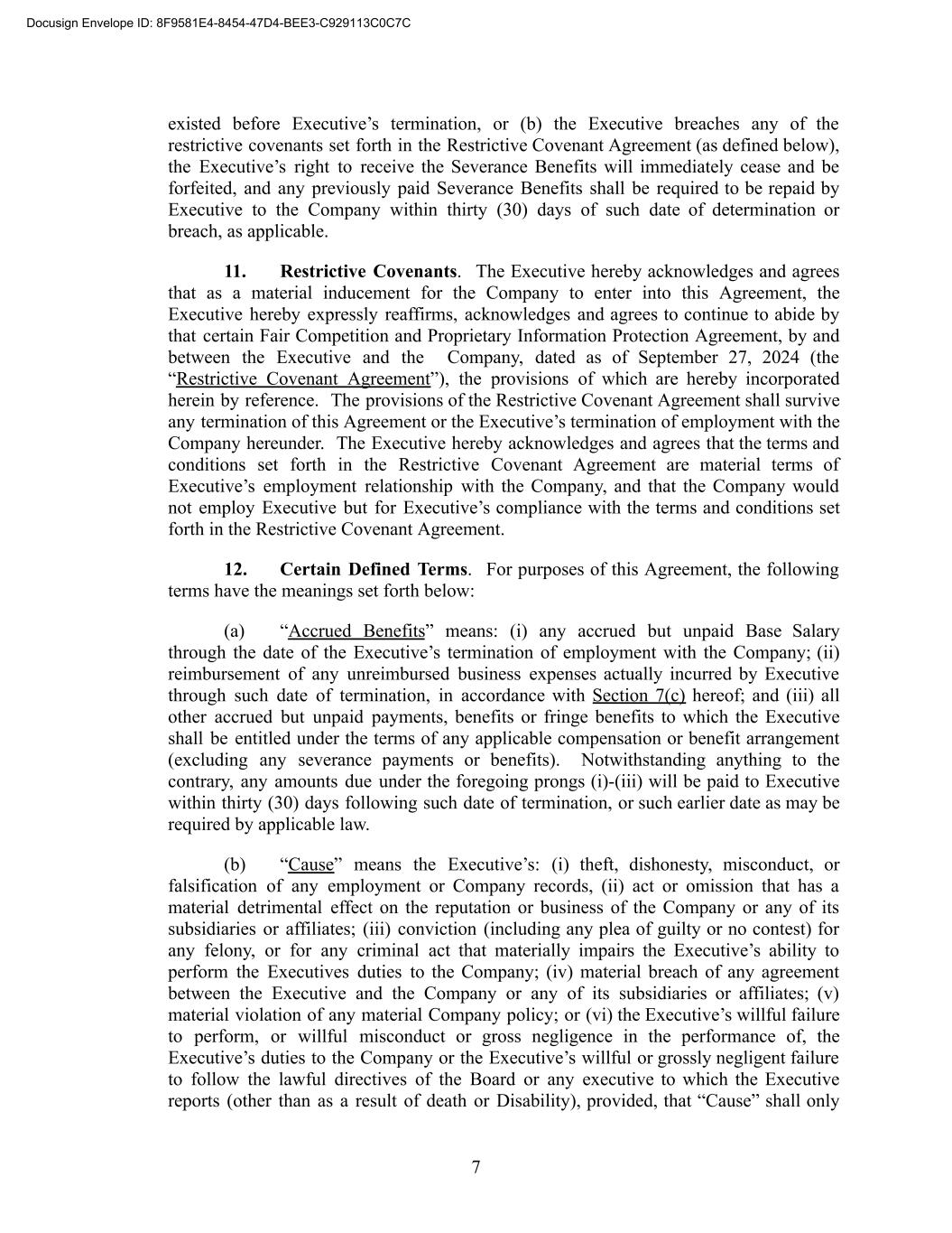 existed before Executive’s termination, or (b) the Executive breaches any of the restrictive covenants set forth in the Restrictive Covenant Agreement (as defined below), the Executive’s right to receive the Severance Benefits will immediately cease and be forfeited, and any previously paid Severance Benefits shall be required to be repaid by Executive to the Company within thirty (30) days of such date of determination or breach, as applicable. 11. Restrictive Covenants. The Executive hereby acknowledges and agrees that as a material inducement for the Company to enter into this Agreement, the Executive hereby expressly reaffirms, acknowledges and agrees to continue to abide by that certain Fair Competition and Proprietary Information Protection Agreement, by and between the Executive and the Company, dated as of September 27, 2024 (the “Restrictive Covenant Agreement”), the provisions of which are hereby incorporated herein by reference. The provisions of the Restrictive Covenant Agreement shall survive any termination of this Agreement or the Executive’s termination of employment with the Company hereunder. The Executive hereby acknowledges and agrees that the terms and conditions set forth in the Restrictive Covenant Agreement are material terms of Executive’s employment relationship with the Company, and that the Company would not employ Executive but for Executive’s compliance with the terms and conditions set forth in the Restrictive Covenant Agreement. 12. Certain Defined Terms. For purposes of this Agreement, the following terms have the meanings set forth below: (a) “Accrued Benefits” means: (i) any accrued but unpaid Base Salary through the date of the Executive’s termination of employment with the Company; (ii) reimbursement of any unreimbursed business expenses actually incurred by Executive through such date of termination, in accordance with Section 7(c) hereof; and (iii) all other accrued but unpaid payments, benefits or fringe benefits to which the Executive shall be entitled under the terms of any applicable compensation or benefit arrangement (excluding any severance payments or benefits). Notwithstanding anything to the contrary, any amounts due under the foregoing prongs (i)-(iii) will be paid to Executive within thirty (30) days following such date of termination, or such earlier date as may be required by applicable law. (b) “Cause” means the Executive’s: (i) theft, dishonesty, misconduct, or falsification of any employment or Company records, (ii) act or omission that has a material detrimental effect on the reputation or business of the Company or any of its subsidiaries or affiliates; (iii) conviction (including any plea of guilty or no contest) for any felony, or for any criminal act that materially impairs the Executive’s ability to perform the Executives duties to the Company; (iv) material breach of any agreement between the Executive and the Company or any of its subsidiaries or affiliates; (v) material violation of any material Company policy; or (vi) the Executive’s willful failure to perform, or willful misconduct or gross negligence in the performance of, the Executive’s duties to the Company or the Executive’s willful or grossly negligent failure to follow the lawful directives of the Board or any executive to which the Executive reports (other than as a result of death or Disability), provided, that “Cause” shall only 7 Docusign Envelope ID: 8F9581E4-8454-47D4-BEE3-C929113C0C7C