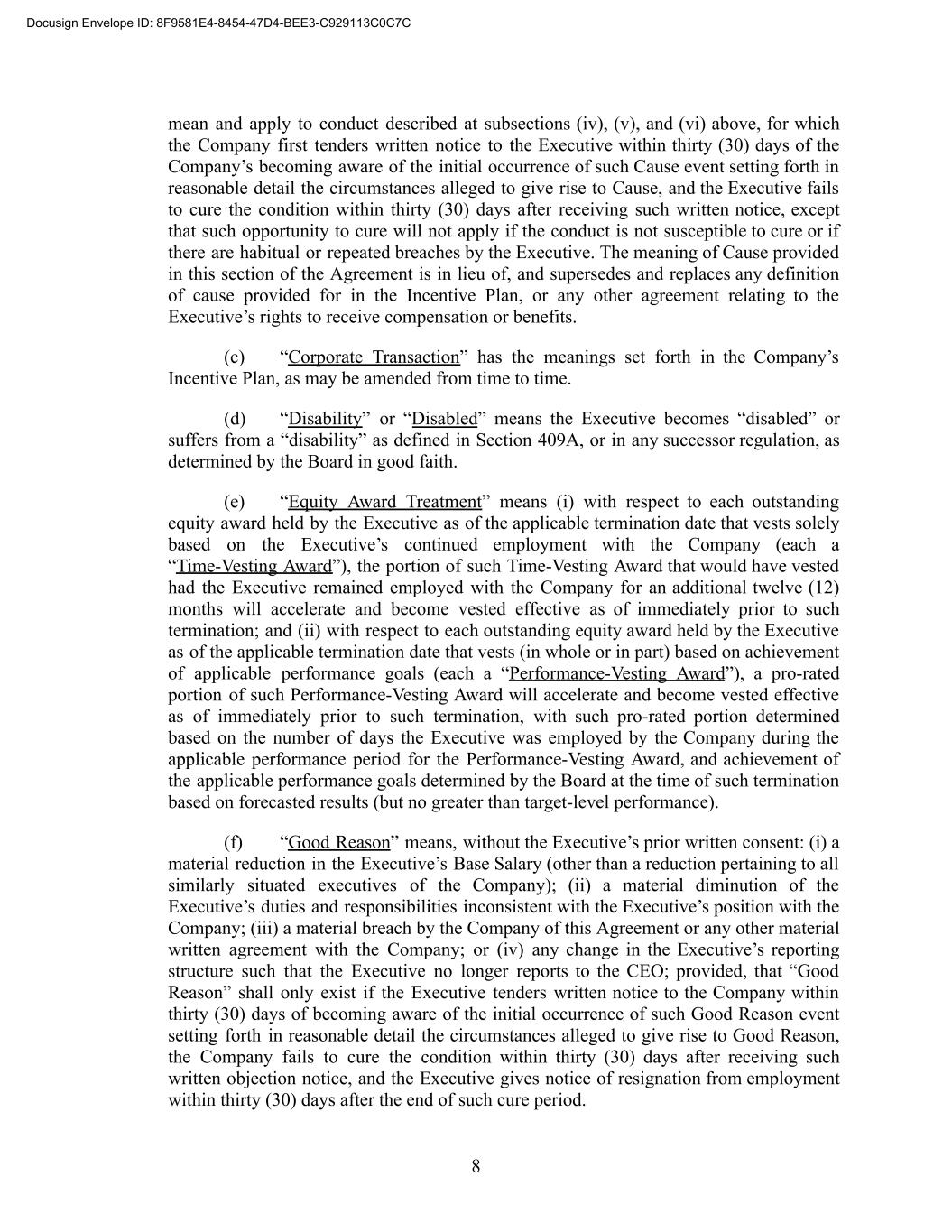mean and apply to conduct described at subsections (iv), (v), and (vi) above, for which the Company first tenders written notice to the Executive within thirty (30) days of the Company’s becoming aware of the initial occurrence of such Cause event setting forth in reasonable detail the circumstances alleged to give rise to Cause, and the Executive fails to cure the condition within thirty (30) days after receiving such written notice, except that such opportunity to cure will not apply if the conduct is not susceptible to cure or if there are habitual or repeated breaches by the Executive. The meaning of Cause provided in this section of the Agreement is in lieu of, and supersedes and replaces any definition of cause provided for in the Incentive Plan, or any other agreement relating to the Executive’s rights to receive compensation or benefits. (c) “Corporate Transaction” has the meanings set forth in the Company’s Incentive Plan, as may be amended from time to time. (d) “Disability” or “Disabled” means the Executive becomes “disabled” or suffers from a “disability” as defined in Section 409A, or in any successor regulation, as determined by the Board in good faith. (e) “Equity Award Treatment” means (i) with respect to each outstanding equity award held by the Executive as of the applicable termination date that vests solely based on the Executive’s continued employment with the Company (each a “Time-Vesting Award”), the portion of such Time-Vesting Award that would have vested had the Executive remained employed with the Company for an additional twelve (12) months will accelerate and become vested effective as of immediately prior to such termination; and (ii) with respect to each outstanding equity award held by the Executive as of the applicable termination date that vests (in whole or in part) based on achievement of applicable performance goals (each a “Performance-Vesting Award”), a pro-rated portion of such Performance-Vesting Award will accelerate and become vested effective as of immediately prior to such termination, with such pro-rated portion determined based on the number of days the Executive was employed by the Company during the applicable performance period for the Performance-Vesting Award, and achievement of the applicable performance goals determined by the Board at the time of such termination based on forecasted results (but no greater than target-level performance). (f) “Good Reason” means, without the Executive’s prior written consent: (i) a material reduction in the Executive’s Base Salary (other than a reduction pertaining to all similarly situated executives of the Company); (ii) a material diminution of the Executive’s duties and responsibilities inconsistent with the Executive’s position with the Company; (iii) a material breach by the Company of this Agreement or any other material written agreement with the Company; or (iv) any change in the Executive’s reporting structure such that the Executive no longer reports to the CEO; provided, that “Good Reason” shall only exist if the Executive tenders written notice to the Company within thirty (30) days of becoming aware of the initial occurrence of such Good Reason event setting forth in reasonable detail the circumstances alleged to give rise to Good Reason, the Company fails to cure the condition within thirty (30) days after receiving such written objection notice, and the Executive gives notice of resignation from employment within thirty (30) days after the end of such cure period. 8 Docusign Envelope ID: 8F9581E4-8454-47D4-BEE3-C929113C0C7C