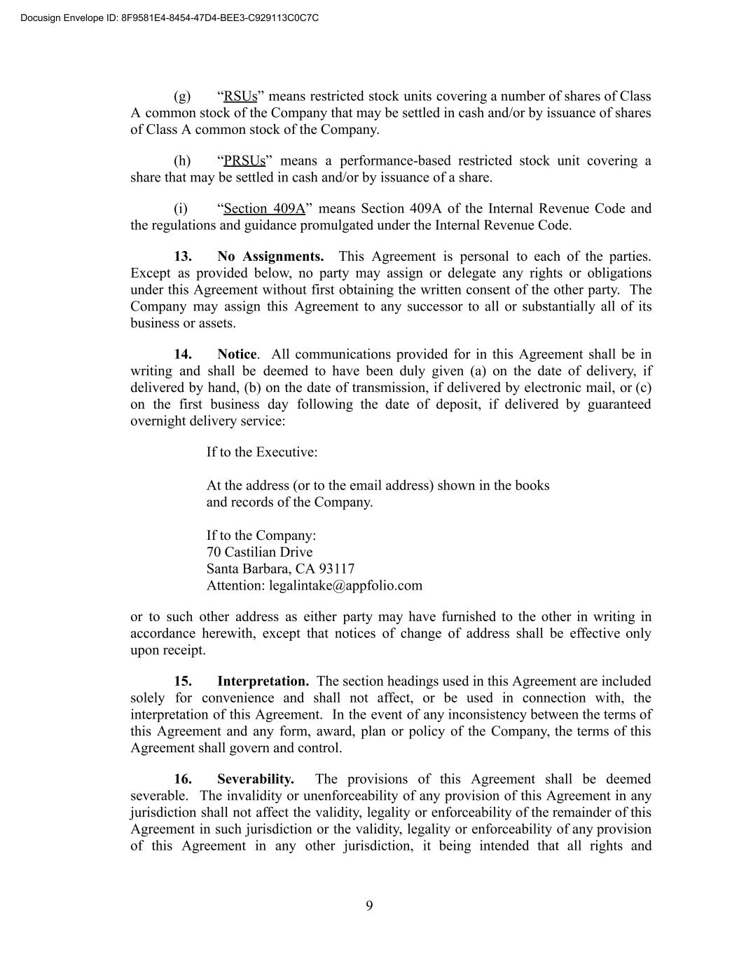(g) “RSUs” means restricted stock units covering a number of shares of Class A common stock of the Company that may be settled in cash and/or by issuance of shares of Class A common stock of the Company. (h) “PRSUs” means a performance-based restricted stock unit covering a share that may be settled in cash and/or by issuance of a share. (i) “Section 409A” means Section 409A of the Internal Revenue Code and the regulations and guidance promulgated under the Internal Revenue Code. 13. No Assignments. This Agreement is personal to each of the parties. Except as provided below, no party may assign or delegate any rights or obligations under this Agreement without first obtaining the written consent of the other party. The Company may assign this Agreement to any successor to all or substantially all of its business or assets. 14. Notice. All communications provided for in this Agreement shall be in writing and shall be deemed to have been duly given (a) on the date of delivery, if delivered by hand, (b) on the date of transmission, if delivered by electronic mail, or (c) on the first business day following the date of deposit, if delivered by guaranteed overnight delivery service: If to the Executive: At the address (or to the email address) shown in the books and records of the Company. If to the Company: 70 Castilian Drive Santa Barbara, CA 93117 Attention: legalintake@appfolio.com or to such other address as either party may have furnished to the other in writing in accordance herewith, except that notices of change of address shall be effective only upon receipt. 15. Interpretation. The section headings used in this Agreement are included solely for convenience and shall not affect, or be used in connection with, the interpretation of this Agreement. In the event of any inconsistency between the terms of this Agreement and any form, award, plan or policy of the Company, the terms of this Agreement shall govern and control. 16. Severability. The provisions of this Agreement shall be deemed severable. The invalidity or unenforceability of any provision of this Agreement in any jurisdiction shall not affect the validity, legality or enforceability of the remainder of this Agreement in such jurisdiction or the validity, legality or enforceability of any provision of this Agreement in any other jurisdiction, it being intended that all rights and 9 Docusign Envelope ID: 8F9581E4-8454-47D4-BEE3-C929113C0C7C