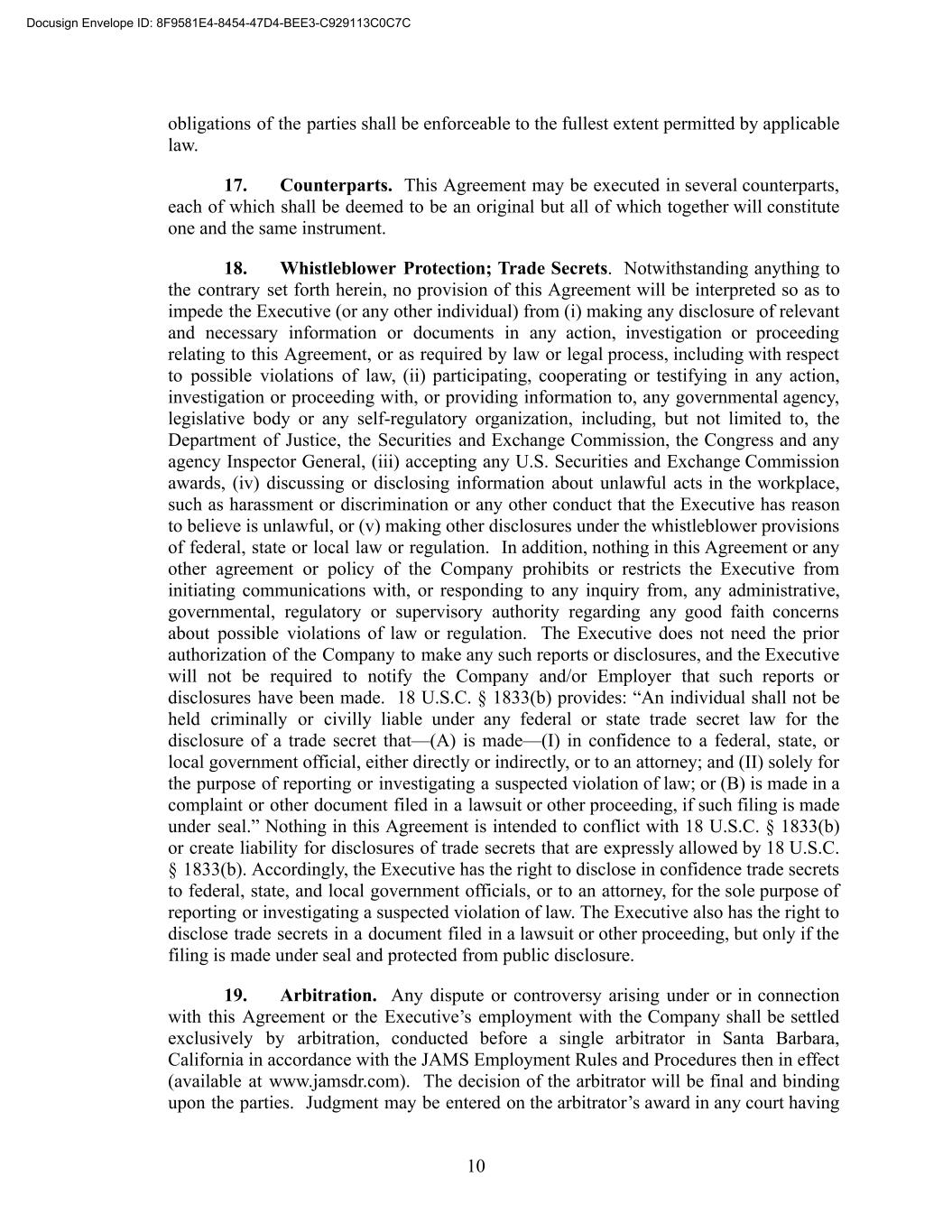 obligations of the parties shall be enforceable to the fullest extent permitted by applicable law. 17. Counterparts. This Agreement may be executed in several counterparts, each of which shall be deemed to be an original but all of which together will constitute one and the same instrument. 18. Whistleblower Protection; Trade Secrets. Notwithstanding anything to the contrary set forth herein, no provision of this Agreement will be interpreted so as to impede the Executive (or any other individual) from (i) making any disclosure of relevant and necessary information or documents in any action, investigation or proceeding relating to this Agreement, or as required by law or legal process, including with respect to possible violations of law, (ii) participating, cooperating or testifying in any action, investigation or proceeding with, or providing information to, any governmental agency, legislative body or any self-regulatory organization, including, but not limited to, the Department of Justice, the Securities and Exchange Commission, the Congress and any agency Inspector General, (iii) accepting any U.S. Securities and Exchange Commission awards, (iv) discussing or disclosing information about unlawful acts in the workplace, such as harassment or discrimination or any other conduct that the Executive has reason to believe is unlawful, or (v) making other disclosures under the whistleblower provisions of federal, state or local law or regulation. In addition, nothing in this Agreement or any other agreement or policy of the Company prohibits or restricts the Executive from initiating communications with, or responding to any inquiry from, any administrative, governmental, regulatory or supervisory authority regarding any good faith concerns about possible violations of law or regulation. The Executive does not need the prior authorization of the Company to make any such reports or disclosures, and the Executive will not be required to notify the Company and/or Employer that such reports or disclosures have been made. 18 U.S.C. § 1833(b) provides: “An individual shall not be held criminally or civilly liable under any federal or state trade secret law for the disclosure of a trade secret that—(A) is made—(I) in confidence to a federal, state, or local government official, either directly or indirectly, or to an attorney; and (II) solely for the purpose of reporting or investigating a suspected violation of law; or (B) is made in a complaint or other document filed in a lawsuit or other proceeding, if such filing is made under seal.” Nothing in this Agreement is intended to conflict with 18 U.S.C. § 1833(b) or create liability for disclosures of trade secrets that are expressly allowed by 18 U.S.C. § 1833(b). Accordingly, the Executive has the right to disclose in confidence trade secrets to federal, state, and local government officials, or to an attorney, for the sole purpose of reporting or investigating a suspected violation of law. The Executive also has the right to disclose trade secrets in a document filed in a lawsuit or other proceeding, but only if the filing is made under seal and protected from public disclosure. 19. Arbitration. Any dispute or controversy arising under or in connection with this Agreement or the Executive’s employment with the Company shall be settled exclusively by arbitration, conducted before a single arbitrator in Santa Barbara, California in accordance with the JAMS Employment Rules and Procedures then in effect (available at www.jamsdr.com). The decision of the arbitrator will be final and binding upon the parties. Judgment may be entered on the arbitrator’s award in any court having 10 Docusign Envelope ID: 8F9581E4-8454-47D4-BEE3-C929113C0C7C