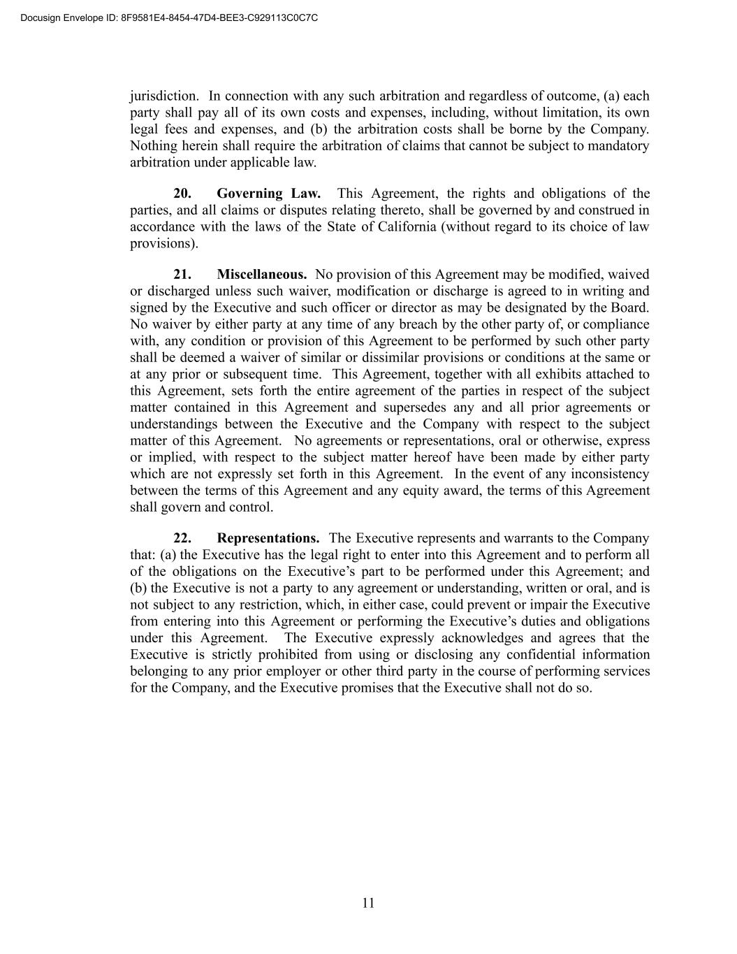 jurisdiction. In connection with any such arbitration and regardless of outcome, (a) each party shall pay all of its own costs and expenses, including, without limitation, its own legal fees and expenses, and (b) the arbitration costs shall be borne by the Company. Nothing herein shall require the arbitration of claims that cannot be subject to mandatory arbitration under applicable law. 20. Governing Law. This Agreement, the rights and obligations of the parties, and all claims or disputes relating thereto, shall be governed by and construed in accordance with the laws of the State of California (without regard to its choice of law provisions). 21. Miscellaneous. No provision of this Agreement may be modified, waived or discharged unless such waiver, modification or discharge is agreed to in writing and signed by the Executive and such officer or director as may be designated by the Board. No waiver by either party at any time of any breach by the other party of, or compliance with, any condition or provision of this Agreement to be performed by such other party shall be deemed a waiver of similar or dissimilar provisions or conditions at the same or at any prior or subsequent time. This Agreement, together with all exhibits attached to this Agreement, sets forth the entire agreement of the parties in respect of the subject matter contained in this Agreement and supersedes any and all prior agreements or understandings between the Executive and the Company with respect to the subject matter of this Agreement. No agreements or representations, oral or otherwise, express or implied, with respect to the subject matter hereof have been made by either party which are not expressly set forth in this Agreement. In the event of any inconsistency between the terms of this Agreement and any equity award, the terms of this Agreement shall govern and control. 22. Representations. The Executive represents and warrants to the Company that: (a) the Executive has the legal right to enter into this Agreement and to perform all of the obligations on the Executive’s part to be performed under this Agreement; and (b) the Executive is not a party to any agreement or understanding, written or oral, and is not subject to any restriction, which, in either case, could prevent or impair the Executive from entering into this Agreement or performing the Executive’s duties and obligations under this Agreement. The Executive expressly acknowledges and agrees that the Executive is strictly prohibited from using or disclosing any confidential information belonging to any prior employer or other third party in the course of performing services for the Company, and the Executive promises that the Executive shall not do so. 11 Docusign Envelope ID: 8F9581E4-8454-47D4-BEE3-C929113C0C7C
