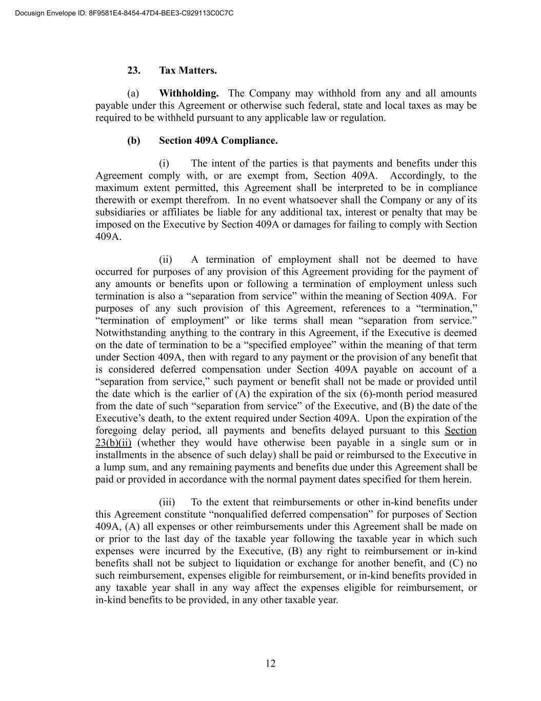 23. Tax Matters. (a) Withholding. The Company may withhold from any and all amounts payable under this Agreement or otherwise such federal, state and local taxes as may be required to be withheld pursuant to any applicable law or regulation. (b) Section 409A Compliance. (i) The intent of the parties is that payments and benefits under this Agreement comply with, or are exempt from, Section 409A. Accordingly, to the maximum extent permitted, this Agreement shall be interpreted to be in compliance therewith or exempt therefrom. In no event whatsoever shall the Company or any of its subsidiaries or affiliates be liable for any additional tax, interest or penalty that may be imposed on the Executive by Section 409A or damages for failing to comply with Section 409A. (ii) A termination of employment shall not be deemed to have occurred for purposes of any provision of this Agreement providing for the payment of any amounts or benefits upon or following a termination of employment unless such termination is also a “separation from service” within the meaning of Section 409A. For purposes of any such provision of this Agreement, references to a “termination,” “termination of employment” or like terms shall mean “separation from service.” Notwithstanding anything to the contrary in this Agreement, if the Executive is deemed on the date of termination to be a “specified employee” within the meaning of that term under Section 409A, then with regard to any payment or the provision of any benefit that is considered deferred compensation under Section 409A payable on account of a “separation from service,” such payment or benefit shall not be made or provided until the date which is the earlier of (A) the expiration of the six (6)-month period measured from the date of such “separation from service” of the Executive, and (B) the date of the Executive’s death, to the extent required under Section 409A. Upon the expiration of the foregoing delay period, all payments and benefits delayed pursuant to this Section 23(b)(ii) (whether they would have otherwise been payable in a single sum or in installments in the absence of such delay) shall be paid or reimbursed to the Executive in a lump sum, and any remaining payments and benefits due under this Agreement shall be paid or provided in accordance with the normal payment dates specified for them herein. (iii) To the extent that reimbursements or other in-kind benefits under this Agreement constitute “nonqualified deferred compensation” for purposes of Section 409A, (A) all expenses or other reimbursements under this Agreement shall be made on or prior to the last day of the taxable year following the taxable year in which such expenses were incurred by the Executive, (B) any right to reimbursement or in-kind benefits shall not be subject to liquidation or exchange for another benefit, and (C) no such reimbursement, expenses eligible for reimbursement, or in-kind benefits provided in any taxable year shall in any way affect the expenses eligible for reimbursement, or in-kind benefits to be provided, in any other taxable year. 12 Docusign Envelope ID: 8F9581E4-8454-47D4-BEE3-C929113C0C7C