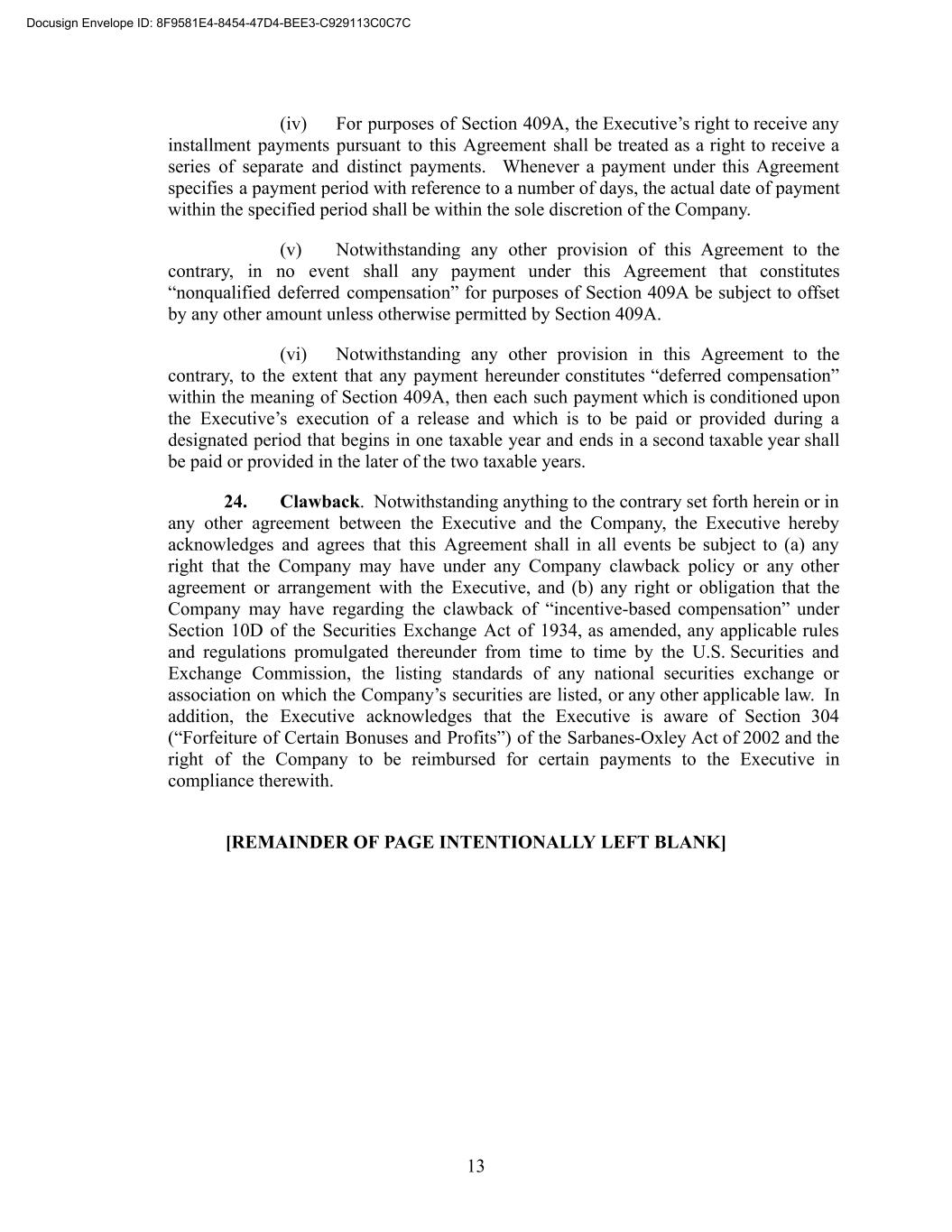 (iv) For purposes of Section 409A, the Executive’s right to receive any installment payments pursuant to this Agreement shall be treated as a right to receive a series of separate and distinct payments. Whenever a payment under this Agreement specifies a payment period with reference to a number of days, the actual date of payment within the specified period shall be within the sole discretion of the Company. (v) Notwithstanding any other provision of this Agreement to the contrary, in no event shall any payment under this Agreement that constitutes “nonqualified deferred compensation” for purposes of Section 409A be subject to offset by any other amount unless otherwise permitted by Section 409A. (vi) Notwithstanding any other provision in this Agreement to the contrary, to the extent that any payment hereunder constitutes “deferred compensation” within the meaning of Section 409A, then each such payment which is conditioned upon the Executive’s execution of a release and which is to be paid or provided during a designated period that begins in one taxable year and ends in a second taxable year shall be paid or provided in the later of the two taxable years. 24. Clawback. Notwithstanding anything to the contrary set forth herein or in any other agreement between the Executive and the Company, the Executive hereby acknowledges and agrees that this Agreement shall in all events be subject to (a) any right that the Company may have under any Company clawback policy or any other agreement or arrangement with the Executive, and (b) any right or obligation that the Company may have regarding the clawback of “incentive-based compensation” under Section 10D of the Securities Exchange Act of 1934, as amended, any applicable rules and regulations promulgated thereunder from time to time by the U.S. Securities and Exchange Commission, the listing standards of any national securities exchange or association on which the Company’s securities are listed, or any other applicable law. In addition, the Executive acknowledges that the Executive is aware of Section 304 (“Forfeiture of Certain Bonuses and Profits”) of the Sarbanes-Oxley Act of 2002 and the right of the Company to be reimbursed for certain payments to the Executive in compliance therewith. [REMAINDER OF PAGE INTENTIONALLY LEFT BLANK] 13 Docusign Envelope ID: 8F9581E4-8454-47D4-BEE3-C929113C0C7C