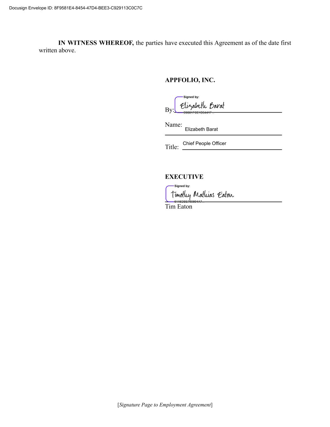IN WITNESS WHEREOF, the parties have executed this Agreement as of the date first written above. [Signature Page to Employment Agreement] APPFOLIO, INC. By: Name: Title: EXECUTIVE Tim Eaton Docusign Envelope ID: 8F9581E4-8454-47D4-BEE3-C929113C0C7C Elizabeth Barat Chief People Officer