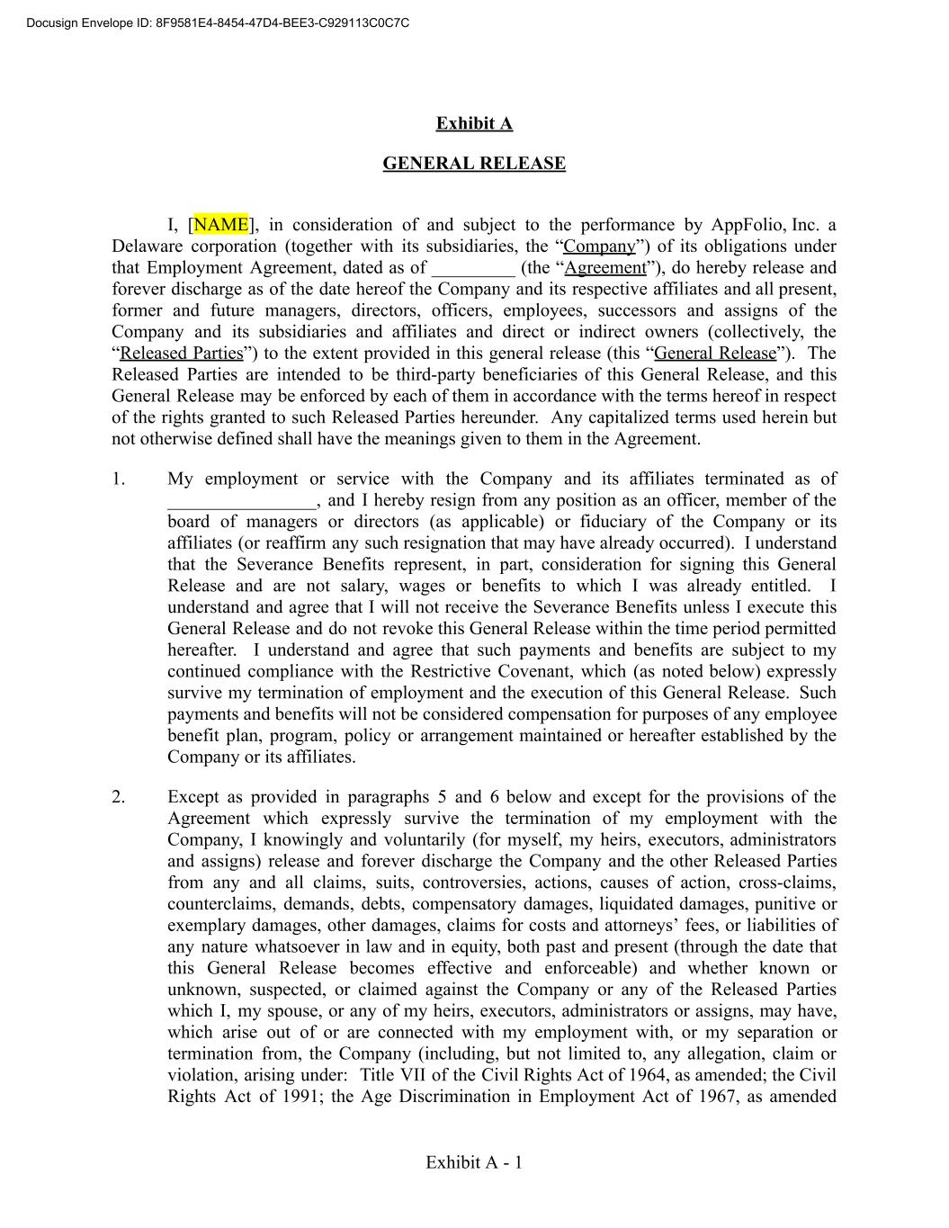 Exhibit A GENERAL RELEASE I, [NAME], in consideration of and subject to the performance by AppFolio, Inc. a Delaware corporation (together with its subsidiaries, the “Company”) of its obligations under that Employment Agreement, dated as of _________ (the “Agreement”), do hereby release and forever discharge as of the date hereof the Company and its respective affiliates and all present, former and future managers, directors, officers, employees, successors and assigns of the Company and its subsidiaries and affiliates and direct or indirect owners (collectively, the “Released Parties”) to the extent provided in this general release (this “General Release”). The Released Parties are intended to be third-party beneficiaries of this General Release, and this General Release may be enforced by each of them in accordance with the terms hereof in respect of the rights granted to such Released Parties hereunder. Any capitalized terms used herein but not otherwise defined shall have the meanings given to them in the Agreement. 1. My employment or service with the Company and its affiliates terminated as of ________________, and I hereby resign from any position as an officer, member of the board of managers or directors (as applicable) or fiduciary of the Company or its affiliates (or reaffirm any such resignation that may have already occurred). I understand that the Severance Benefits represent, in part, consideration for signing this General Release and are not salary, wages or benefits to which I was already entitled. I understand and agree that I will not receive the Severance Benefits unless I execute this General Release and do not revoke this General Release within the time period permitted hereafter. I understand and agree that such payments and benefits are subject to my continued compliance with the Restrictive Covenant, which (as noted below) expressly survive my termination of employment and the execution of this General Release. Such payments and benefits will not be considered compensation for purposes of any employee benefit plan, program, policy or arrangement maintained or hereafter established by the Company or its affiliates. 2. Except as provided in paragraphs 5 and 6 below and except for the provisions of the Agreement which expressly survive the termination of my employment with the Company, I knowingly and voluntarily (for myself, my heirs, executors, administrators and assigns) release and forever discharge the Company and the other Released Parties from any and all claims, suits, controversies, actions, causes of action, cross-claims, counterclaims, demands, debts, compensatory damages, liquidated damages, punitive or exemplary damages, other damages, claims for costs and attorneys’ fees, or liabilities of any nature whatsoever in law and in equity, both past and present (through the date that this General Release becomes effective and enforceable) and whether known or unknown, suspected, or claimed against the Company or any of the Released Parties which I, my spouse, or any of my heirs, executors, administrators or assigns, may have, which arise out of or are connected with my employment with, or my separation or termination from, the Company (including, but not limited to, any allegation, claim or violation, arising under: Title VII of the Civil Rights Act of 1964, as amended; the Civil Rights Act of 1991; the Age Discrimination in Employment Act of 1967, as amended Exhibit A - 1 Docusign Envelope ID: 8F9581E4-8454-47D4-BEE3-C929113C0C7C