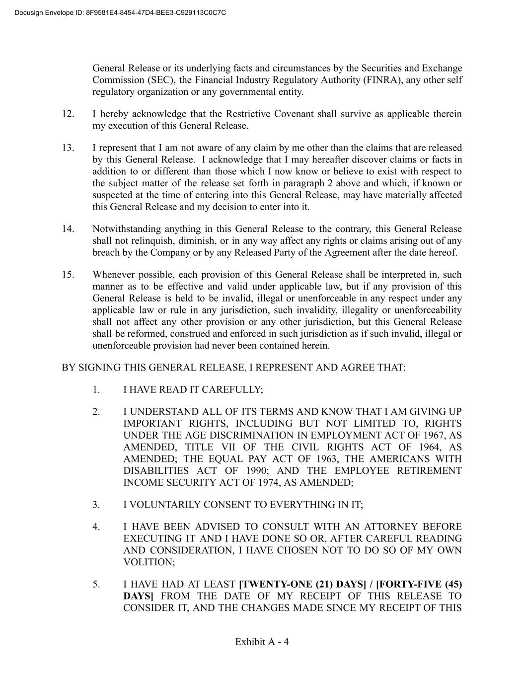 General Release or its underlying facts and circumstances by the Securities and Exchange Commission (SEC), the Financial Industry Regulatory Authority (FINRA), any other self regulatory organization or any governmental entity. 12. I hereby acknowledge that the Restrictive Covenant shall survive as applicable therein my execution of this General Release. 13. I represent that I am not aware of any claim by me other than the claims that are released by this General Release. I acknowledge that I may hereafter discover claims or facts in addition to or different than those which I now know or believe to exist with respect to the subject matter of the release set forth in paragraph 2 above and which, if known or suspected at the time of entering into this General Release, may have materially affected this General Release and my decision to enter into it. 14. Notwithstanding anything in this General Release to the contrary, this General Release shall not relinquish, diminish, or in any way affect any rights or claims arising out of any breach by the Company or by any Released Party of the Agreement after the date hereof. 15. Whenever possible, each provision of this General Release shall be interpreted in, such manner as to be effective and valid under applicable law, but if any provision of this General Release is held to be invalid, illegal or unenforceable in any respect under any applicable law or rule in any jurisdiction, such invalidity, illegality or unenforceability shall not affect any other provision or any other jurisdiction, but this General Release shall be reformed, construed and enforced in such jurisdiction as if such invalid, illegal or unenforceable provision had never been contained herein. BY SIGNING THIS GENERAL RELEASE, I REPRESENT AND AGREE THAT: 1. I HAVE READ IT CAREFULLY; 2. I UNDERSTAND ALL OF ITS TERMS AND KNOW THAT I AM GIVING UP IMPORTANT RIGHTS, INCLUDING BUT NOT LIMITED TO, RIGHTS UNDER THE AGE DISCRIMINATION IN EMPLOYMENT ACT OF 1967, AS AMENDED, TITLE VII OF THE CIVIL RIGHTS ACT OF 1964, AS AMENDED; THE EQUAL PAY ACT OF 1963, THE AMERICANS WITH DISABILITIES ACT OF 1990; AND THE EMPLOYEE RETIREMENT INCOME SECURITY ACT OF 1974, AS AMENDED; 3. I VOLUNTARILY CONSENT TO EVERYTHING IN IT; 4. I HAVE BEEN ADVISED TO CONSULT WITH AN ATTORNEY BEFORE EXECUTING IT AND I HAVE DONE SO OR, AFTER CAREFUL READING AND CONSIDERATION, I HAVE CHOSEN NOT TO DO SO OF MY OWN VOLITION; 5. I HAVE HAD AT LEAST [TWENTY-ONE (21) DAYS] / [FORTY-FIVE (45) DAYS] FROM THE DATE OF MY RECEIPT OF THIS RELEASE TO CONSIDER IT, AND THE CHANGES MADE SINCE MY RECEIPT OF THIS Exhibit A - 4 Docusign Envelope ID: 8F9581E4-8454-47D4-BEE3-C929113C0C7C