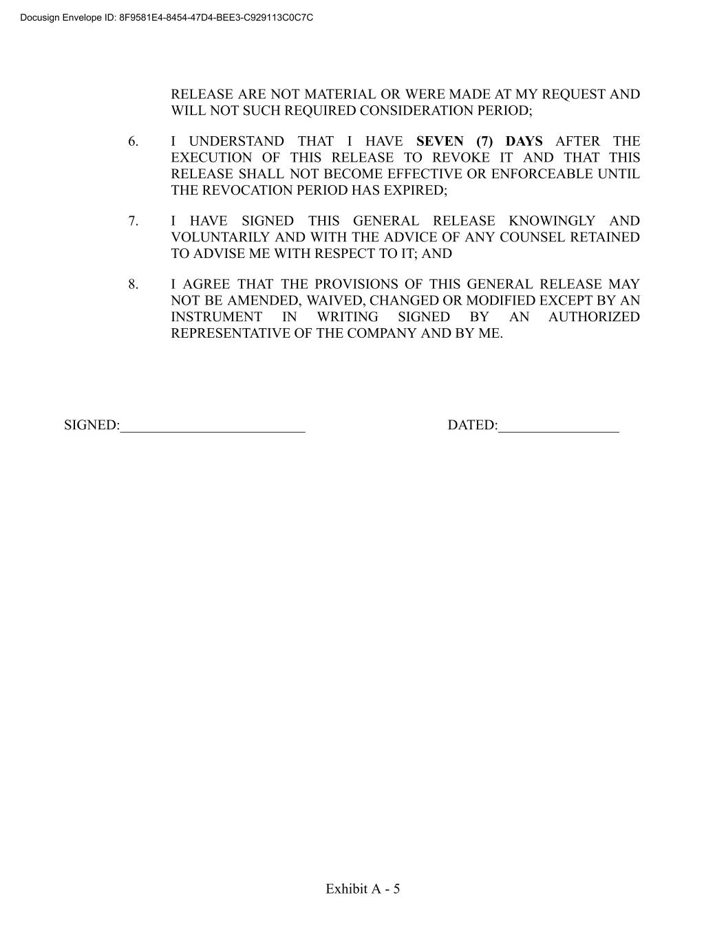 RELEASE ARE NOT MATERIAL OR WERE MADE AT MY REQUEST AND WILL NOT SUCH REQUIRED CONSIDERATION PERIOD; 6. I UNDERSTAND THAT I HAVE SEVEN (7) DAYS AFTER THE EXECUTION OF THIS RELEASE TO REVOKE IT AND THAT THIS RELEASE SHALL NOT BECOME EFFECTIVE OR ENFORCEABLE UNTIL THE REVOCATION PERIOD HAS EXPIRED; 7. I HAVE SIGNED THIS GENERAL RELEASE KNOWINGLY AND VOLUNTARILY AND WITH THE ADVICE OF ANY COUNSEL RETAINED TO ADVISE ME WITH RESPECT TO IT; AND 8. I AGREE THAT THE PROVISIONS OF THIS GENERAL RELEASE MAY NOT BE AMENDED, WAIVED, CHANGED OR MODIFIED EXCEPT BY AN INSTRUMENT IN WRITING SIGNED BY AN AUTHORIZED REPRESENTATIVE OF THE COMPANY AND BY ME. SIGNED:__________________________ DATED:_________________ Exhibit A - 5 Docusign Envelope ID: 8F9581E4-8454-47D4-BEE3-C929113C0C7C