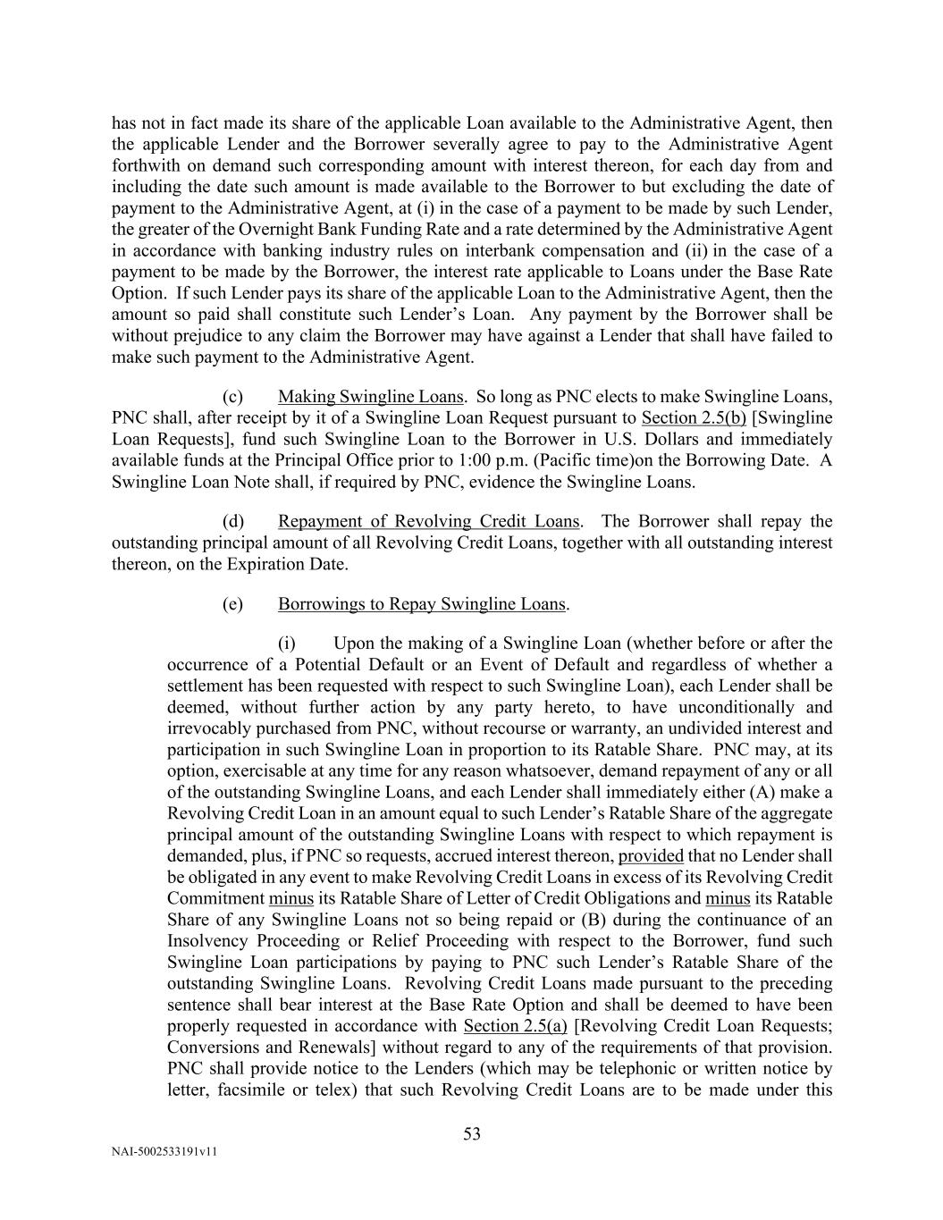 NAI-5002533191v11 53 has not in fact made its share of the applicable Loan available to the Administrative Agent, then the applicable Lender and the Borrower severally agree to pay to the Administrative Agent forthwith on demand such corresponding amount with interest thereon, for each day from and including the date such amount is made available to the Borrower to but excluding the date of payment to the Administrative Agent, at (i) in the case of a payment to be made by such Lender, the greater of the Overnight Bank Funding Rate and a rate determined by the Administrative Agent in accordance with banking industry rules on interbank compensation and (ii) in the case of a payment to be made by the Borrower, the interest rate applicable to Loans under the Base Rate Option. If such Lender pays its share of the applicable Loan to the Administrative Agent, then the amount so paid shall constitute such Lender’s Loan. Any payment by the Borrower shall be without prejudice to any claim the Borrower may have against a Lender that shall have failed to make such payment to the Administrative Agent. (c) Making Swingline Loans. So long as PNC elects to make Swingline Loans, PNC shall, after receipt by it of a Swingline Loan Request pursuant to Section 2.5(b) [Swingline Loan Requests], fund such Swingline Loan to the Borrower in U.S. Dollars and immediately available funds at the Principal Office prior to 1:00 p.m. (Pacific time)on the Borrowing Date. A Swingline Loan Note shall, if required by PNC, evidence the Swingline Loans. (d) Repayment of Revolving Credit Loans. The Borrower shall repay the outstanding principal amount of all Revolving Credit Loans, together with all outstanding interest thereon, on the Expiration Date. (e) Borrowings to Repay Swingline Loans. (i) Upon the making of a Swingline Loan (whether before or after the occurrence of a Potential Default or an Event of Default and regardless of whether a settlement has been requested with respect to such Swingline Loan), each Lender shall be deemed, without further action by any party hereto, to have unconditionally and irrevocably purchased from PNC, without recourse or warranty, an undivided interest and participation in such Swingline Loan in proportion to its Ratable Share. PNC may, at its option, exercisable at any time for any reason whatsoever, demand repayment of any or all of the outstanding Swingline Loans, and each Lender shall immediately either (A) make a Revolving Credit Loan in an amount equal to such Lender’s Ratable Share of the aggregate principal amount of the outstanding Swingline Loans with respect to which repayment is demanded, plus, if PNC so requests, accrued interest thereon, provided that no Lender shall be obligated in any event to make Revolving Credit Loans in excess of its Revolving Credit Commitment minus its Ratable Share of Letter of Credit Obligations and minus its Ratable Share of any Swingline Loans not so being repaid or (B) during the continuance of an Insolvency Proceeding or Relief Proceeding with respect to the Borrower, fund such Swingline Loan participations by paying to PNC such Lender’s Ratable Share of the outstanding Swingline Loans. Revolving Credit Loans made pursuant to the preceding sentence shall bear interest at the Base Rate Option and shall be deemed to have been properly requested in accordance with Section 2.5(a) [Revolving Credit Loan Requests; Conversions and Renewals] without regard to any of the requirements of that provision. PNC shall provide notice to the Lenders (which may be telephonic or written notice by letter, facsimile or telex) that such Revolving Credit Loans are to be made under this