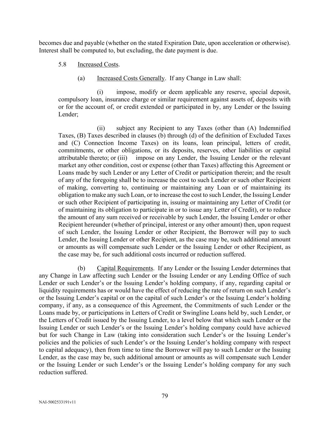 NAI-5002533191v11 79 becomes due and payable (whether on the stated Expiration Date, upon acceleration or otherwise). Interest shall be computed to, but excluding, the date payment is due. 5.8 Increased Costs. (a) Increased Costs Generally. If any Change in Law shall: (i) impose, modify or deem applicable any reserve, special deposit, compulsory loan, insurance charge or similar requirement against assets of, deposits with or for the account of, or credit extended or participated in by, any Lender or the Issuing Lender; (ii) subject any Recipient to any Taxes (other than (A) Indemnified Taxes, (B) Taxes described in clauses (b) through (d) of the definition of Excluded Taxes and (C) Connection Income Taxes) on its loans, loan principal, letters of credit, commitments, or other obligations, or its deposits, reserves, other liabilities or capital attributable thereto; or (iii) impose on any Lender, the Issuing Lender or the relevant market any other condition, cost or expense (other than Taxes) affecting this Agreement or Loans made by such Lender or any Letter of Credit or participation therein; and the result of any of the foregoing shall be to increase the cost to such Lender or such other Recipient of making, converting to, continuing or maintaining any Loan or of maintaining its obligation to make any such Loan, or to increase the cost to such Lender, the Issuing Lender or such other Recipient of participating in, issuing or maintaining any Letter of Credit (or of maintaining its obligation to participate in or to issue any Letter of Credit), or to reduce the amount of any sum received or receivable by such Lender, the Issuing Lender or other Recipient hereunder (whether of principal, interest or any other amount) then, upon request of such Lender, the Issuing Lender or other Recipient, the Borrower will pay to such Lender, the Issuing Lender or other Recipient, as the case may be, such additional amount or amounts as will compensate such Lender or the Issuing Lender or other Recipient, as the case may be, for such additional costs incurred or reduction suffered. (b) Capital Requirements. If any Lender or the Issuing Lender determines that any Change in Law affecting such Lender or the Issuing Lender or any Lending Office of such Lender or such Lender’s or the Issuing Lender’s holding company, if any, regarding capital or liquidity requirements has or would have the effect of reducing the rate of return on such Lender’s or the Issuing Lender’s capital or on the capital of such Lender’s or the Issuing Lender’s holding company, if any, as a consequence of this Agreement, the Commitments of such Lender or the Loans made by, or participations in Letters of Credit or Swingline Loans held by, such Lender, or the Letters of Credit issued by the Issuing Lender, to a level below that which such Lender or the Issuing Lender or such Lender’s or the Issuing Lender’s holding company could have achieved but for such Change in Law (taking into consideration such Lender’s or the Issuing Lender’s policies and the policies of such Lender’s or the Issuing Lender’s holding company with respect to capital adequacy), then from time to time the Borrower will pay to such Lender or the Issuing Lender, as the case may be, such additional amount or amounts as will compensate such Lender or the Issuing Lender or such Lender’s or the Issuing Lender’s holding company for any such reduction suffered.