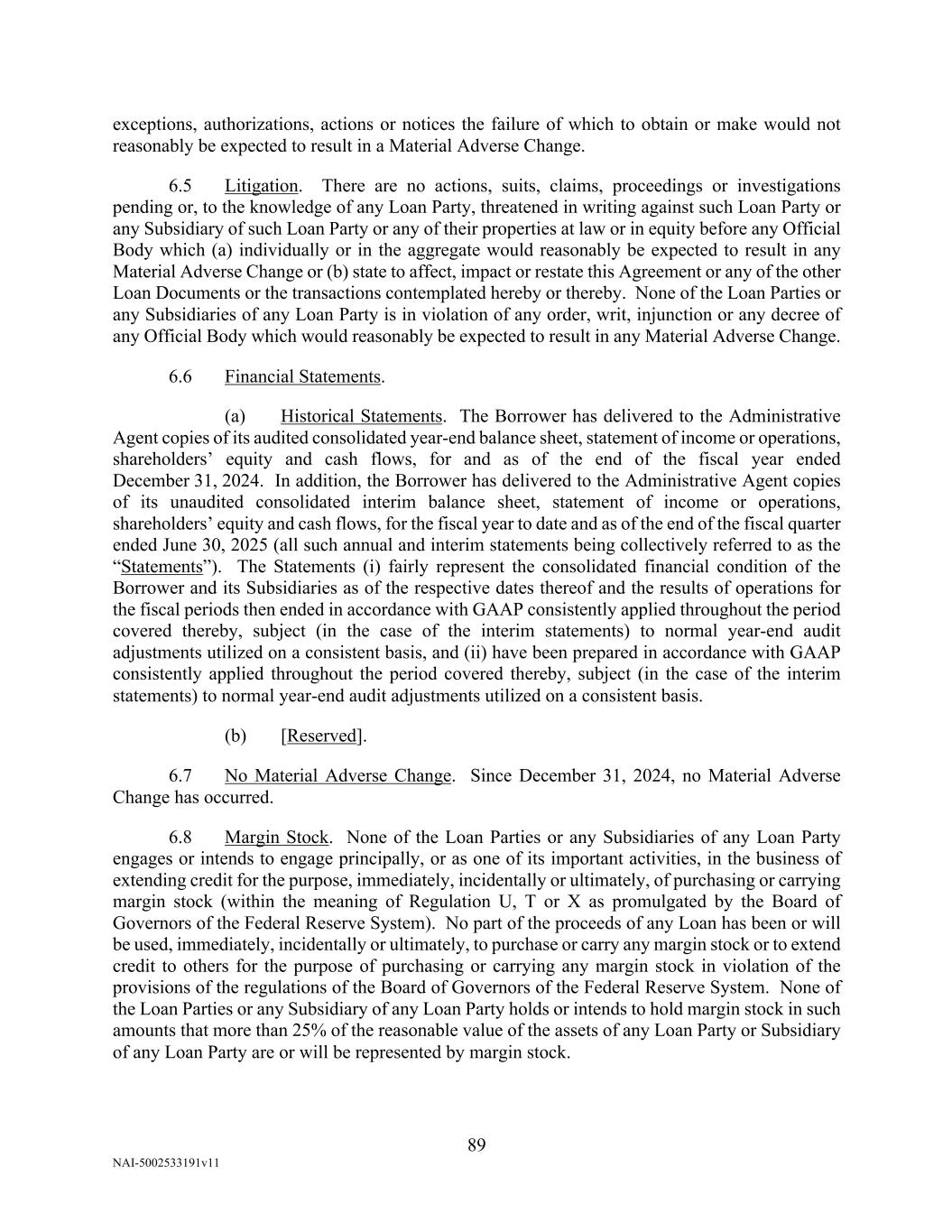 NAI-5002533191v11 89 exceptions, authorizations, actions or notices the failure of which to obtain or make would not reasonably be expected to result in a Material Adverse Change. 6.5 Litigation. There are no actions, suits, claims, proceedings or investigations pending or, to the knowledge of any Loan Party, threatened in writing against such Loan Party or any Subsidiary of such Loan Party or any of their properties at law or in equity before any Official Body which (a) individually or in the aggregate would reasonably be expected to result in any Material Adverse Change or (b) state to affect, impact or restate this Agreement or any of the other Loan Documents or the transactions contemplated hereby or thereby. None of the Loan Parties or any Subsidiaries of any Loan Party is in violation of any order, writ, injunction or any decree of any Official Body which would reasonably be expected to result in any Material Adverse Change. 6.6 Financial Statements. (a) Historical Statements. The Borrower has delivered to the Administrative Agent copies of its audited consolidated year-end balance sheet, statement of income or operations, shareholders’ equity and cash flows, for and as of the end of the fiscal year ended December 31, 2024. In addition, the Borrower has delivered to the Administrative Agent copies of its unaudited consolidated interim balance sheet, statement of income or operations, shareholders’ equity and cash flows, for the fiscal year to date and as of the end of the fiscal quarter ended June 30, 2025 (all such annual and interim statements being collectively referred to as the “Statements”). The Statements (i) fairly represent the consolidated financial condition of the Borrower and its Subsidiaries as of the respective dates thereof and the results of operations for the fiscal periods then ended in accordance with GAAP consistently applied throughout the period covered thereby, subject (in the case of the interim statements) to normal year-end audit adjustments utilized on a consistent basis, and (ii) have been prepared in accordance with GAAP consistently applied throughout the period covered thereby, subject (in the case of the interim statements) to normal year-end audit adjustments utilized on a consistent basis. (b) [Reserved]. 6.7 No Material Adverse Change. Since December 31, 2024, no Material Adverse Change has occurred. 6.8 Margin Stock. None of the Loan Parties or any Subsidiaries of any Loan Party engages or intends to engage principally, or as one of its important activities, in the business of extending credit for the purpose, immediately, incidentally or ultimately, of purchasing or carrying margin stock (within the meaning of Regulation U, T or X as promulgated by the Board of Governors of the Federal Reserve System). No part of the proceeds of any Loan has been or will be used, immediately, incidentally or ultimately, to purchase or carry any margin stock or to extend credit to others for the purpose of purchasing or carrying any margin stock in violation of the provisions of the regulations of the Board of Governors of the Federal Reserve System. None of the Loan Parties or any Subsidiary of any Loan Party holds or intends to hold margin stock in such amounts that more than 25% of the reasonable value of the assets of any Loan Party or Subsidiary of any Loan Party are or will be represented by margin stock.