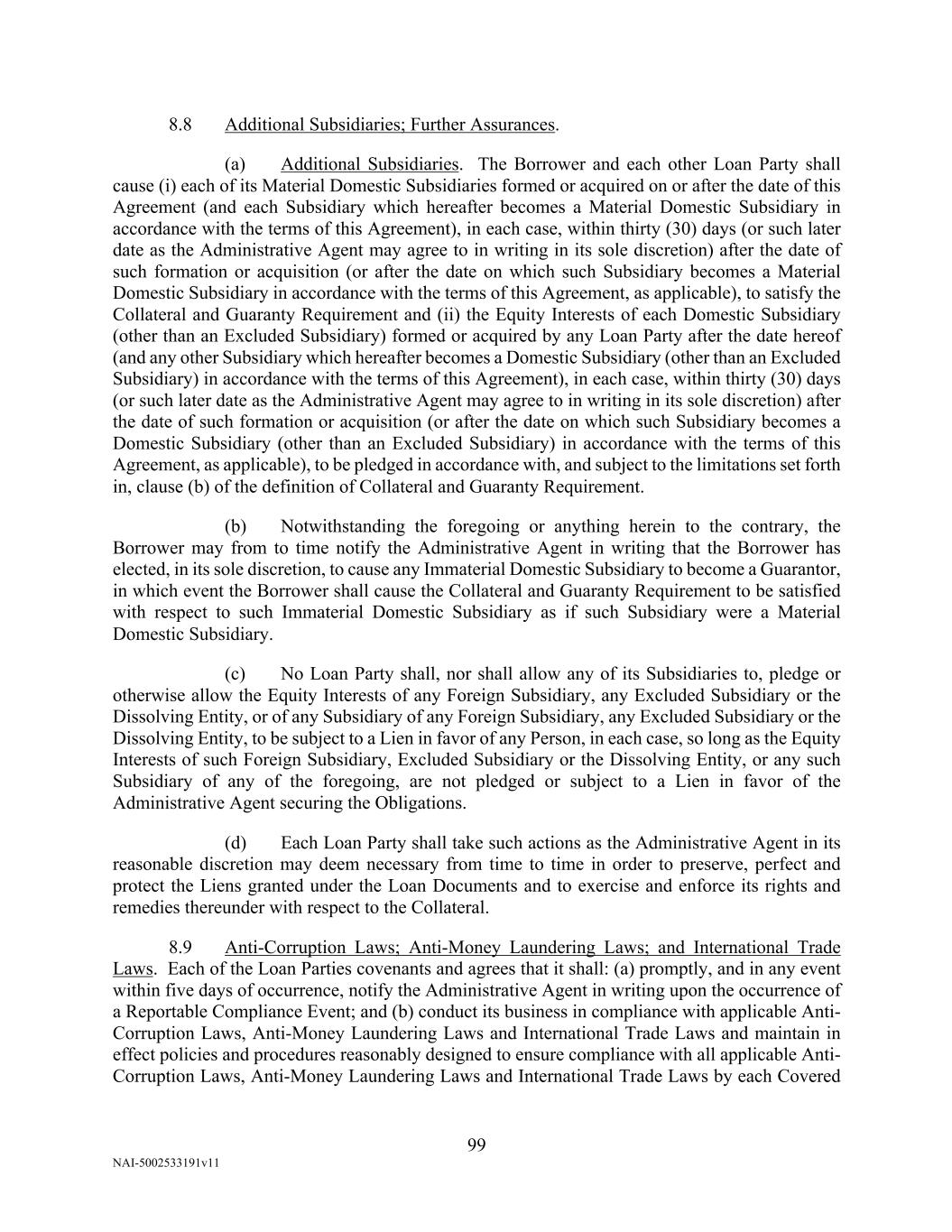 NAI-5002533191v11 99 8.8 Additional Subsidiaries; Further Assurances. (a) Additional Subsidiaries. The Borrower and each other Loan Party shall cause (i) each of its Material Domestic Subsidiaries formed or acquired on or after the date of this Agreement (and each Subsidiary which hereafter becomes a Material Domestic Subsidiary in accordance with the terms of this Agreement), in each case, within thirty (30) days (or such later date as the Administrative Agent may agree to in writing in its sole discretion) after the date of such formation or acquisition (or after the date on which such Subsidiary becomes a Material Domestic Subsidiary in accordance with the terms of this Agreement, as applicable), to satisfy the Collateral and Guaranty Requirement and (ii) the Equity Interests of each Domestic Subsidiary (other than an Excluded Subsidiary) formed or acquired by any Loan Party after the date hereof (and any other Subsidiary which hereafter becomes a Domestic Subsidiary (other than an Excluded Subsidiary) in accordance with the terms of this Agreement), in each case, within thirty (30) days (or such later date as the Administrative Agent may agree to in writing in its sole discretion) after the date of such formation or acquisition (or after the date on which such Subsidiary becomes a Domestic Subsidiary (other than an Excluded Subsidiary) in accordance with the terms of this Agreement, as applicable), to be pledged in accordance with, and subject to the limitations set forth in, clause (b) of the definition of Collateral and Guaranty Requirement. (b) Notwithstanding the foregoing or anything herein to the contrary, the Borrower may from to time notify the Administrative Agent in writing that the Borrower has elected, in its sole discretion, to cause any Immaterial Domestic Subsidiary to become a Guarantor, in which event the Borrower shall cause the Collateral and Guaranty Requirement to be satisfied with respect to such Immaterial Domestic Subsidiary as if such Subsidiary were a Material Domestic Subsidiary. (c) No Loan Party shall, nor shall allow any of its Subsidiaries to, pledge or otherwise allow the Equity Interests of any Foreign Subsidiary, any Excluded Subsidiary or the Dissolving Entity, or of any Subsidiary of any Foreign Subsidiary, any Excluded Subsidiary or the Dissolving Entity, to be subject to a Lien in favor of any Person, in each case, so long as the Equity Interests of such Foreign Subsidiary, Excluded Subsidiary or the Dissolving Entity, or any such Subsidiary of any of the foregoing, are not pledged or subject to a Lien in favor of the Administrative Agent securing the Obligations. (d) Each Loan Party shall take such actions as the Administrative Agent in its reasonable discretion may deem necessary from time to time in order to preserve, perfect and protect the Liens granted under the Loan Documents and to exercise and enforce its rights and remedies thereunder with respect to the Collateral. 8.9 Anti-Corruption Laws; Anti-Money Laundering Laws; and International Trade Laws. Each of the Loan Parties covenants and agrees that it shall: (a) promptly, and in any event within five days of occurrence, notify the Administrative Agent in writing upon the occurrence of a Reportable Compliance Event; and (b) conduct its business in compliance with applicable Anti- Corruption Laws, Anti-Money Laundering Laws and International Trade Laws and maintain in effect policies and procedures reasonably designed to ensure compliance with all applicable Anti- Corruption Laws, Anti-Money Laundering Laws and International Trade Laws by each Covered