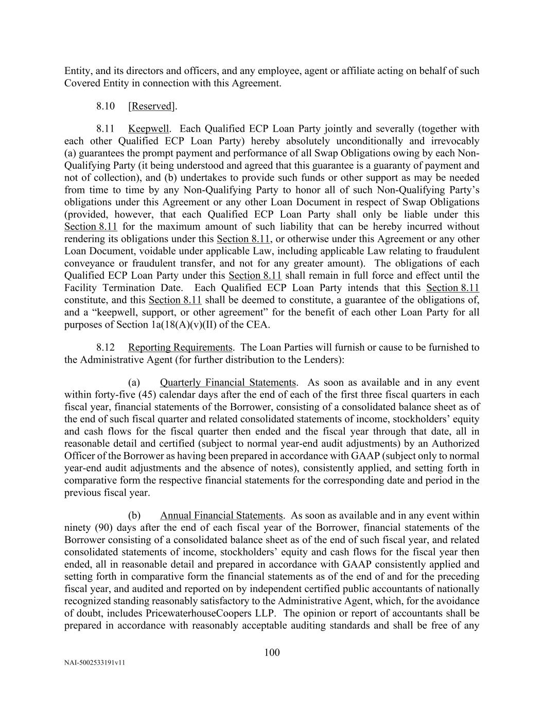 NAI-5002533191v11 100 Entity, and its directors and officers, and any employee, agent or affiliate acting on behalf of such Covered Entity in connection with this Agreement. 8.10 [Reserved]. 8.11 Keepwell. Each Qualified ECP Loan Party jointly and severally (together with each other Qualified ECP Loan Party) hereby absolutely unconditionally and irrevocably (a) guarantees the prompt payment and performance of all Swap Obligations owing by each Non- Qualifying Party (it being understood and agreed that this guarantee is a guaranty of payment and not of collection), and (b) undertakes to provide such funds or other support as may be needed from time to time by any Non-Qualifying Party to honor all of such Non-Qualifying Party’s obligations under this Agreement or any other Loan Document in respect of Swap Obligations (provided, however, that each Qualified ECP Loan Party shall only be liable under this Section 8.11 for the maximum amount of such liability that can be hereby incurred without rendering its obligations under this Section 8.11, or otherwise under this Agreement or any other Loan Document, voidable under applicable Law, including applicable Law relating to fraudulent conveyance or fraudulent transfer, and not for any greater amount). The obligations of each Qualified ECP Loan Party under this Section 8.11 shall remain in full force and effect until the Facility Termination Date. Each Qualified ECP Loan Party intends that this Section 8.11 constitute, and this Section 8.11 shall be deemed to constitute, a guarantee of the obligations of, and a “keepwell, support, or other agreement” for the benefit of each other Loan Party for all purposes of Section 1a(18(A)(v)(II) of the CEA. 8.12 Reporting Requirements. The Loan Parties will furnish or cause to be furnished to the Administrative Agent (for further distribution to the Lenders): (a) Quarterly Financial Statements. As soon as available and in any event within forty-five (45) calendar days after the end of each of the first three fiscal quarters in each fiscal year, financial statements of the Borrower, consisting of a consolidated balance sheet as of the end of such fiscal quarter and related consolidated statements of income, stockholders’ equity and cash flows for the fiscal quarter then ended and the fiscal year through that date, all in reasonable detail and certified (subject to normal year-end audit adjustments) by an Authorized Officer of the Borrower as having been prepared in accordance with GAAP (subject only to normal year-end audit adjustments and the absence of notes), consistently applied, and setting forth in comparative form the respective financial statements for the corresponding date and period in the previous fiscal year. (b) Annual Financial Statements. As soon as available and in any event within ninety (90) days after the end of each fiscal year of the Borrower, financial statements of the Borrower consisting of a consolidated balance sheet as of the end of such fiscal year, and related consolidated statements of income, stockholders’ equity and cash flows for the fiscal year then ended, all in reasonable detail and prepared in accordance with GAAP consistently applied and setting forth in comparative form the financial statements as of the end of and for the preceding fiscal year, and audited and reported on by independent certified public accountants of nationally recognized standing reasonably satisfactory to the Administrative Agent, which, for the avoidance of doubt, includes PricewaterhouseCoopers LLP. The opinion or report of accountants shall be prepared in accordance with reasonably acceptable auditing standards and shall be free of any
