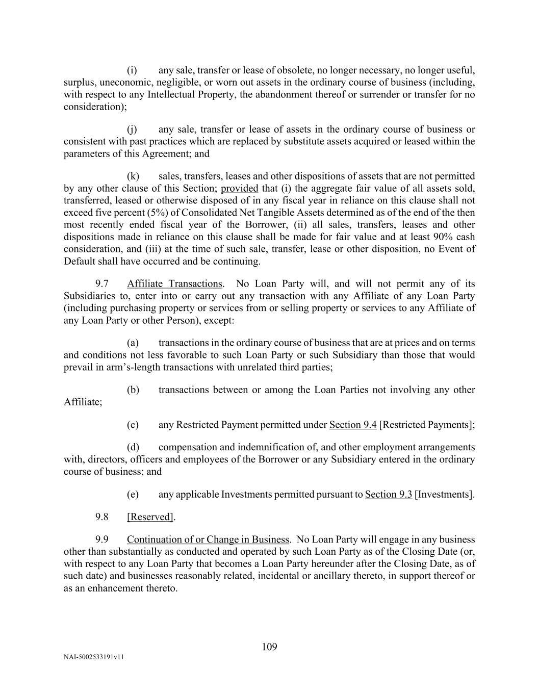 NAI-5002533191v11 109 (i) any sale, transfer or lease of obsolete, no longer necessary, no longer useful, surplus, uneconomic, negligible, or worn out assets in the ordinary course of business (including, with respect to any Intellectual Property, the abandonment thereof or surrender or transfer for no consideration); (j) any sale, transfer or lease of assets in the ordinary course of business or consistent with past practices which are replaced by substitute assets acquired or leased within the parameters of this Agreement; and (k) sales, transfers, leases and other dispositions of assets that are not permitted by any other clause of this Section; provided that (i) the aggregate fair value of all assets sold, transferred, leased or otherwise disposed of in any fiscal year in reliance on this clause shall not exceed five percent (5%) of Consolidated Net Tangible Assets determined as of the end of the then most recently ended fiscal year of the Borrower, (ii) all sales, transfers, leases and other dispositions made in reliance on this clause shall be made for fair value and at least 90% cash consideration, and (iii) at the time of such sale, transfer, lease or other disposition, no Event of Default shall have occurred and be continuing. 9.7 Affiliate Transactions. No Loan Party will, and will not permit any of its Subsidiaries to, enter into or carry out any transaction with any Affiliate of any Loan Party (including purchasing property or services from or selling property or services to any Affiliate of any Loan Party or other Person), except: (a) transactions in the ordinary course of business that are at prices and on terms and conditions not less favorable to such Loan Party or such Subsidiary than those that would prevail in arm’s-length transactions with unrelated third parties; (b) transactions between or among the Loan Parties not involving any other Affiliate; (c) any Restricted Payment permitted under Section 9.4 [Restricted Payments]; (d) compensation and indemnification of, and other employment arrangements with, directors, officers and employees of the Borrower or any Subsidiary entered in the ordinary course of business; and (e) any applicable Investments permitted pursuant to Section 9.3 [Investments]. 9.8 [Reserved]. 9.9 Continuation of or Change in Business. No Loan Party will engage in any business other than substantially as conducted and operated by such Loan Party as of the Closing Date (or, with respect to any Loan Party that becomes a Loan Party hereunder after the Closing Date, as of such date) and businesses reasonably related, incidental or ancillary thereto, in support thereof or as an enhancement thereto.