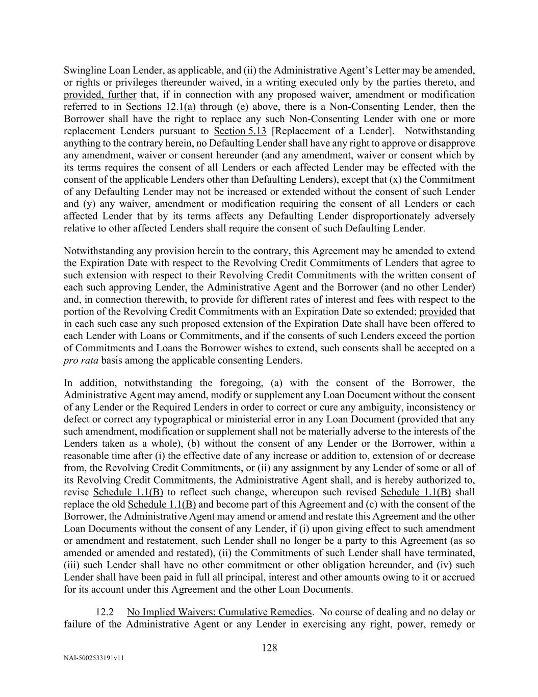 NAI-5002533191v11 128 Swingline Loan Lender, as applicable, and (ii) the Administrative Agent’s Letter may be amended, or rights or privileges thereunder waived, in a writing executed only by the parties thereto, and provided, further that, if in connection with any proposed waiver, amendment or modification referred to in Sections 12.1(a) through (e) above, there is a Non-Consenting Lender, then the Borrower shall have the right to replace any such Non-Consenting Lender with one or more replacement Lenders pursuant to Section 5.13 [Replacement of a Lender]. Notwithstanding anything to the contrary herein, no Defaulting Lender shall have any right to approve or disapprove any amendment, waiver or consent hereunder (and any amendment, waiver or consent which by its terms requires the consent of all Lenders or each affected Lender may be effected with the consent of the applicable Lenders other than Defaulting Lenders), except that (x) the Commitment of any Defaulting Lender may not be increased or extended without the consent of such Lender and (y) any waiver, amendment or modification requiring the consent of all Lenders or each affected Lender that by its terms affects any Defaulting Lender disproportionately adversely relative to other affected Lenders shall require the consent of such Defaulting Lender. Notwithstanding any provision herein to the contrary, this Agreement may be amended to extend the Expiration Date with respect to the Revolving Credit Commitments of Lenders that agree to such extension with respect to their Revolving Credit Commitments with the written consent of each such approving Lender, the Administrative Agent and the Borrower (and no other Lender) and, in connection therewith, to provide for different rates of interest and fees with respect to the portion of the Revolving Credit Commitments with an Expiration Date so extended; provided that in each such case any such proposed extension of the Expiration Date shall have been offered to each Lender with Loans or Commitments, and if the consents of such Lenders exceed the portion of Commitments and Loans the Borrower wishes to extend, such consents shall be accepted on a pro rata basis among the applicable consenting Lenders. In addition, notwithstanding the foregoing, (a) with the consent of the Borrower, the Administrative Agent may amend, modify or supplement any Loan Document without the consent of any Lender or the Required Lenders in order to correct or cure any ambiguity, inconsistency or defect or correct any typographical or ministerial error in any Loan Document (provided that any such amendment, modification or supplement shall not be materially adverse to the interests of the Lenders taken as a whole), (b) without the consent of any Lender or the Borrower, within a reasonable time after (i) the effective date of any increase or addition to, extension of or decrease from, the Revolving Credit Commitments, or (ii) any assignment by any Lender of some or all of its Revolving Credit Commitments, the Administrative Agent shall, and is hereby authorized to, revise Schedule 1.1(B) to reflect such change, whereupon such revised Schedule 1.1(B) shall replace the old Schedule 1.1(B) and become part of this Agreement and (c) with the consent of the Borrower, the Administrative Agent may amend or amend and restate this Agreement and the other Loan Documents without the consent of any Lender, if (i) upon giving effect to such amendment or amendment and restatement, such Lender shall no longer be a party to this Agreement (as so amended or amended and restated), (ii) the Commitments of such Lender shall have terminated, (iii) such Lender shall have no other commitment or other obligation hereunder, and (iv) such Lender shall have been paid in full all principal, interest and other amounts owing to it or accrued for its account under this Agreement and the other Loan Documents. 12.2 No Implied Waivers; Cumulative Remedies. No course of dealing and no delay or failure of the Administrative Agent or any Lender in exercising any right, power, remedy or