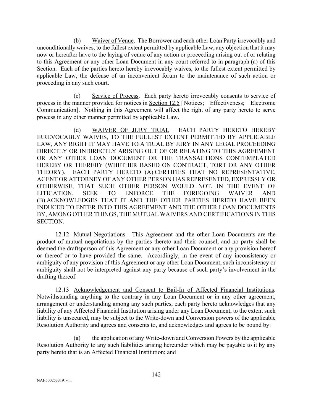 NAI-5002533191v11 142 (b) Waiver of Venue. The Borrower and each other Loan Party irrevocably and unconditionally waives, to the fullest extent permitted by applicable Law, any objection that it may now or hereafter have to the laying of venue of any action or proceeding arising out of or relating to this Agreement or any other Loan Document in any court referred to in paragraph (a) of this Section. Each of the parties hereto hereby irrevocably waives, to the fullest extent permitted by applicable Law, the defense of an inconvenient forum to the maintenance of such action or proceeding in any such court. (c) Service of Process. Each party hereto irrevocably consents to service of process in the manner provided for notices in Section 12.5 [ Notices; Effectiveness; Electronic Communication]. Nothing in this Agreement will affect the right of any party hereto to serve process in any other manner permitted by applicable Law. (d) WAIVER OF JURY TRIAL. EACH PARTY HERETO HEREBY IRREVOCABLY WAIVES, TO THE FULLEST EXTENT PERMITTED BY APPLICABLE LAW, ANY RIGHT IT MAY HAVE TO A TRIAL BY JURY IN ANY LEGAL PROCEEDING DIRECTLY OR INDIRECTLY ARISING OUT OF OR RELATING TO THIS AGREEMENT OR ANY OTHER LOAN DOCUMENT OR THE TRANSACTIONS CONTEMPLATED HEREBY OR THEREBY (WHETHER BASED ON CONTRACT, TORT OR ANY OTHER THEORY). EACH PARTY HERETO (A) CERTIFIES THAT NO REPRESENTATIVE, AGENT OR ATTORNEY OF ANY OTHER PERSON HAS REPRESENTED, EXPRESSLY OR OTHERWISE, THAT SUCH OTHER PERSON WOULD NOT, IN THE EVENT OF LITIGATION, SEEK TO ENFORCE THE FOREGOING WAIVER AND (B) ACKNOWLEDGES THAT IT AND THE OTHER PARTIES HERETO HAVE BEEN INDUCED TO ENTER INTO THIS AGREEMENT AND THE OTHER LOAN DOCUMENTS BY, AMONG OTHER THINGS, THE MUTUAL WAIVERS AND CERTIFICATIONS IN THIS SECTION. 12.12 Mutual Negotiations. This Agreement and the other Loan Documents are the product of mutual negotiations by the parties thereto and their counsel, and no party shall be deemed the draftsperson of this Agreement or any other Loan Document or any provision hereof or thereof or to have provided the same. Accordingly, in the event of any inconsistency or ambiguity of any provision of this Agreement or any other Loan Document, such inconsistency or ambiguity shall not be interpreted against any party because of such party’s involvement in the drafting thereof. 12.13 Acknowledgement and Consent to Bail-In of Affected Financial Institutions. Notwithstanding anything to the contrary in any Loan Document or in any other agreement, arrangement or understanding among any such parties, each party hereto acknowledges that any liability of any Affected Financial Institution arising under any Loan Document, to the extent such liability is unsecured, may be subject to the Write-down and Conversion powers of the applicable Resolution Authority and agrees and consents to, and acknowledges and agrees to be bound by: (a) the application of any Write-down and Conversion Powers by the applicable Resolution Authority to any such liabilities arising hereunder which may be payable to it by any party hereto that is an Affected Financial Institution; and