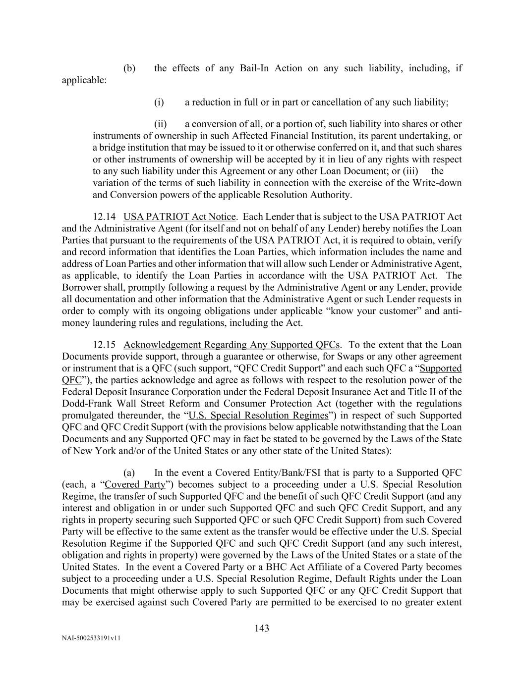 NAI-5002533191v11 143 (b) the effects of any Bail-In Action on any such liability, including, if applicable: (i) a reduction in full or in part or cancellation of any such liability; (ii) a conversion of all, or a portion of, such liability into shares or other instruments of ownership in such Affected Financial Institution, its parent undertaking, or a bridge institution that may be issued to it or otherwise conferred on it, and that such shares or other instruments of ownership will be accepted by it in lieu of any rights with respect to any such liability under this Agreement or any other Loan Document; or (iii) the variation of the terms of such liability in connection with the exercise of the Write-down and Conversion powers of the applicable Resolution Authority. 12.14 USA PATRIOT Act Notice. Each Lender that is subject to the USA PATRIOT Act and the Administrative Agent (for itself and not on behalf of any Lender) hereby notifies the Loan Parties that pursuant to the requirements of the USA PATRIOT Act, it is required to obtain, verify and record information that identifies the Loan Parties, which information includes the name and address of Loan Parties and other information that will allow such Lender or Administrative Agent, as applicable, to identify the Loan Parties in accordance with the USA PATRIOT Act. The Borrower shall, promptly following a request by the Administrative Agent or any Lender, provide all documentation and other information that the Administrative Agent or such Lender requests in order to comply with its ongoing obligations under applicable “know your customer” and anti- money laundering rules and regulations, including the Act. 12.15 Acknowledgement Regarding Any Supported QFCs. To the extent that the Loan Documents provide support, through a guarantee or otherwise, for Swaps or any other agreement or instrument that is a QFC (such support, “QFC Credit Support” and each such QFC a “Supported QFC”), the parties acknowledge and agree as follows with respect to the resolution power of the Federal Deposit Insurance Corporation under the Federal Deposit Insurance Act and Title II of the Dodd-Frank Wall Street Reform and Consumer Protection Act (together with the regulations promulgated thereunder, the “U.S. Special Resolution Regimes”) in respect of such Supported QFC and QFC Credit Support (with the provisions below applicable notwithstanding that the Loan Documents and any Supported QFC may in fact be stated to be governed by the Laws of the State of New York and/or of the United States or any other state of the United States): (a) In the event a Covered Entity/Bank/FSI that is party to a Supported QFC (each, a “Covered Party”) becomes subject to a proceeding under a U.S. Special Resolution Regime, the transfer of such Supported QFC and the benefit of such QFC Credit Support (and any interest and obligation in or under such Supported QFC and such QFC Credit Support, and any rights in property securing such Supported QFC or such QFC Credit Support) from such Covered Party will be effective to the same extent as the transfer would be effective under the U.S. Special Resolution Regime if the Supported QFC and such QFC Credit Support (and any such interest, obligation and rights in property) were governed by the Laws of the United States or a state of the United States. In the event a Covered Party or a BHC Act Affiliate of a Covered Party becomes subject to a proceeding under a U.S. Special Resolution Regime, Default Rights under the Loan Documents that might otherwise apply to such Supported QFC or any QFC Credit Support that may be exercised against such Covered Party are permitted to be exercised to no greater extent