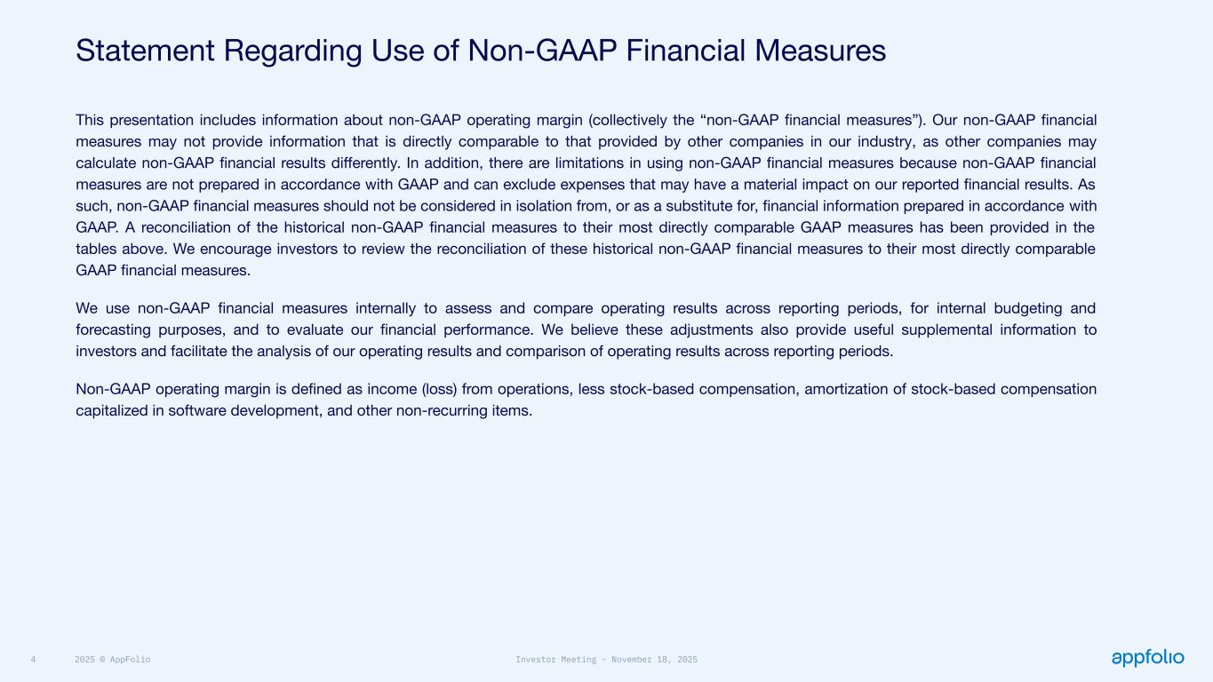 3 2025 © AppFolio Investor Meeting - November 18, 2025 This presentation contains forward-looking statements within the meaning of federal securities laws, which statements involve substantial risks and uncertainties. Forward-looking statements made in this presentation are based primarily on our current expectations and projections about future events and trends that we believe may affect our business, financial condition, operating results, and prospects. In some cases, you can identify forward-looking statements by the use of words such as “may,” “will,” “should,” “might,” “expect,” “plan,” “anticipate,” “could,” “intend,” “target,” “project,” “contemplate,” “believe,” “estimate,” “predict,” “potential,” or “continue,” or the negative of these words or other similar terms or expressions that concern our expectations, strategy, plans, or intentions. Examples of forward-looking statements include, among others, statements made regarding product development plans, future product functionality or availability, future market conditions and size, growth in the size of our business and number of customers, strategic plans and objectives, business forecasts and plans, our future or assumed financial condition, ARPU potential, results of operations and liquidity, trends affecting our business and industry, the competitive environment, responding to customer needs, and capital resource allocation plans. Further information on the above and other risks that could cause our actual results to differ materially from our current expectations and projections can be found in our Annual Report on Form 10-K filed for the year ended December 31, 2024 and in our other Securities and Exchange Commission (“SEC”) filings, including our most recent Quarterly Report on Form 10-Q, which are available on our website at https://ir.appfolioinc.com/ or the SEC’s website at www.sec.gov. We cannot guarantee that we will achieve the plans, intentions, or expectations disclosed in our forward-looking statements, and you should not place undue reliance on our forward-looking statements. Forward-looking statements represent our management’s beliefs and assumptions only as of the date of this presentation. Our forward-looking statements do not reflect the potential impact of any future acquisitions, mergers, dispositions, joint ventures, or investments we may make. We undertake no obligation, and do not intend, to update these forward-looking statements, to review or confirm analysts’ expectations, or to provide interim reports or updates on the progress of the current financial quarter. The information in this presentation on new products, features, or functionality is intended solely to outline our general product direction. It is not a commitment to deliver any product, feature, or functionality; and our product direction may change at any time without notice. As such, the information may not be incorporated into any contract and purchases should not be contingent upon it. Numbers in this presentation may be rounded for presentation purposes. Safe Harbor Statement and Other Information