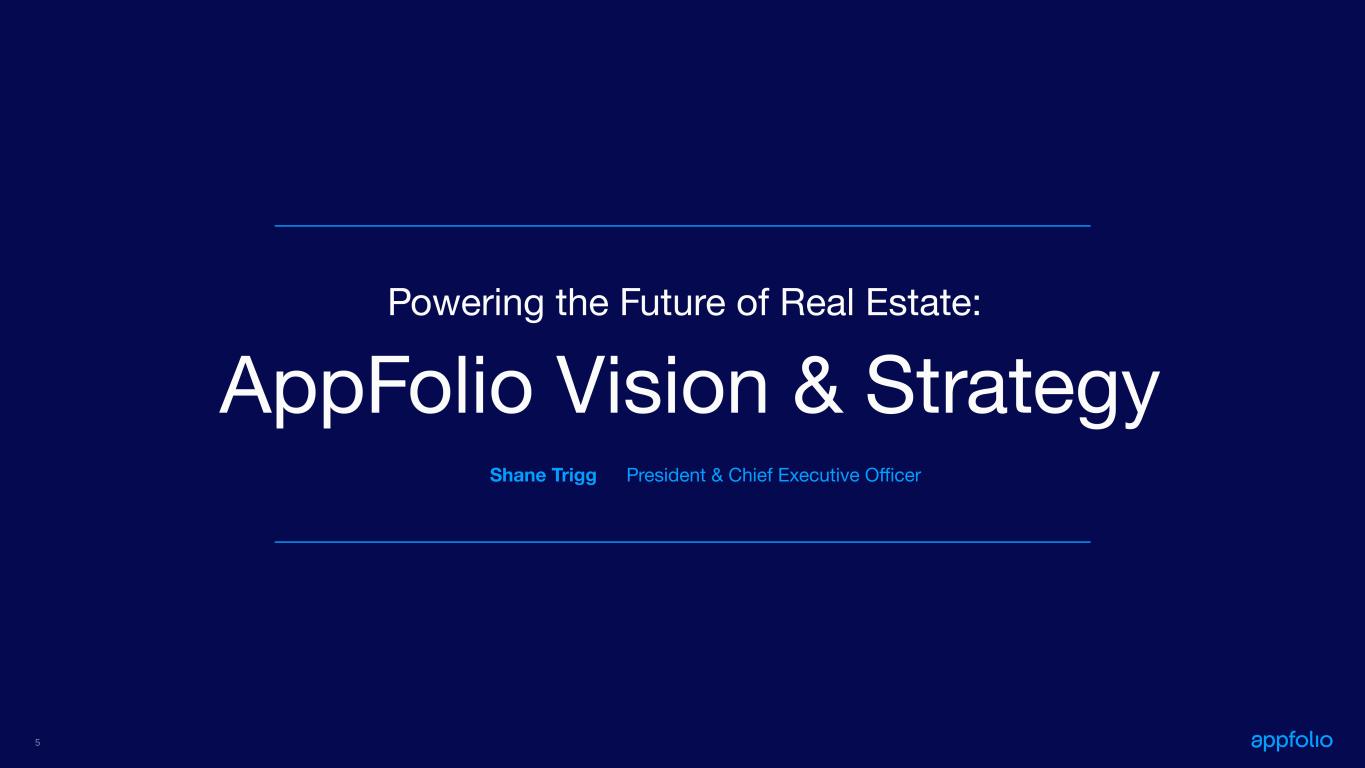 4 2025 © AppFolio Investor Meeting - November 18, 2025 This presentation includes information about non-GAAP operating margin (collectively the “non-GAAP financial measures”). Our non-GAAP financial measures may not provide information that is directly comparable to that provided by other companies in our industry, as other companies may calculate non-GAAP financial results differently. In addition, there are limitations in using non-GAAP financial measures because non-GAAP financial measures are not prepared in accordance with GAAP and can exclude expenses that may have a material impact on our reported financial results. As such, non-GAAP financial measures should not be considered in isolation from, or as a substitute for, financial information prepared in accordance with GAAP. A reconciliation of the historical non-GAAP financial measures to their most directly comparable GAAP measures has been provided in the tables above. We encourage investors to review the reconciliation of these historical non-GAAP financial measures to their most directly comparable GAAP financial measures. We use non-GAAP financial measures internally to assess and compare operating results across reporting periods, for internal budgeting and forecasting purposes, and to evaluate our financial performance. We believe these adjustments also provide useful supplemental information to investors and facilitate the analysis of our operating results and comparison of operating results across reporting periods. Non-GAAP operating margin is defined as income (loss) from operations, less stock-based compensation, amortization of stock-based compensation capitalized in software development, and other non-recurring items. Statement Regarding Use of Non-GAAP Financial Measures