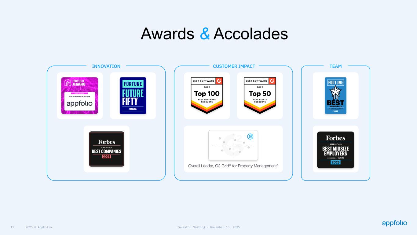 10 2025 © AppFolio Investor Meeting - November 18, 2025 “Moving to AppFolio was a seamless experience, which speaks volumes about the partnership. AppFolio’s significant and ongoing investment in product development, along with their client-first support team, reinforces our confidence that Northpoint’s residents and owners will continue to have the best experiences and outcomes.” Adam Haleck CEO 8,000 Units Customer since 2024 AppFolio Powers Winning Businesses