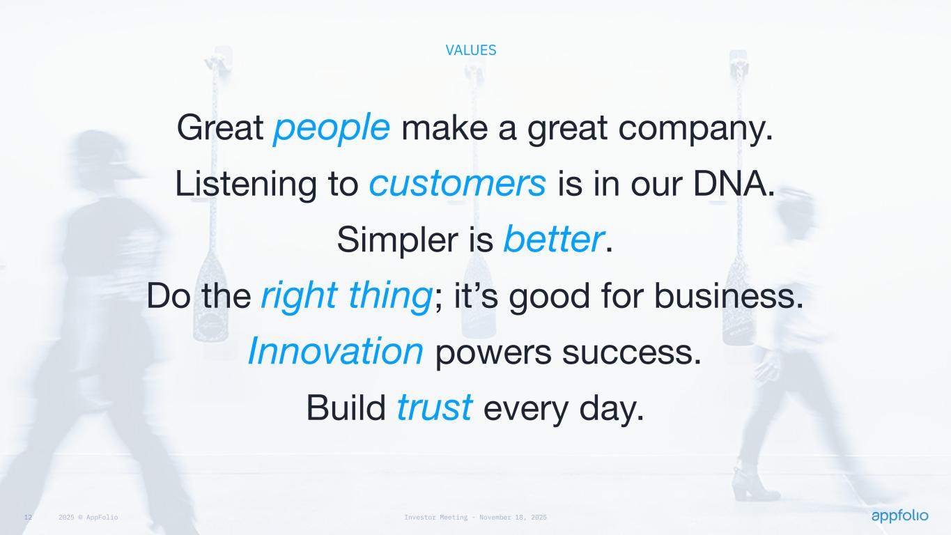 12 2025 © AppFolio Investor Meeting - November 18, 2025 Great people make a great company. Listening to customers is in our DNA. Do the right thing; it’s good for business. Simpler is better. Innovation powers success. Build trust every day. VALUES