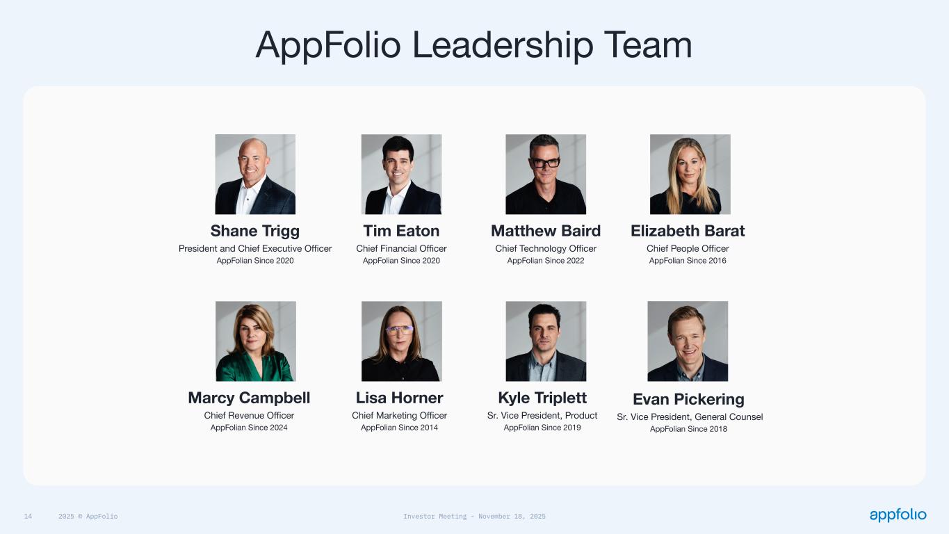 14 2025 © AppFolio Investor Meeting - November 18, 2025 AppFolio Leadership Team Shane Trigg President and Chief Executive Officer AppFolian Since 2020 Kyle Triplett Sr. Vice President, Product AppFolian Since 2019 Tim Eaton Chief Financial Officer AppFolian Since 2020 Matthew Baird Chief Technology Officer AppFolian Since 2022 Elizabeth Barat Chief People Officer AppFolian Since 2016 Marcy Campbell Chief Revenue Officer AppFolian Since 2024 Lisa Horner Chief Marketing Officer AppFolian Since 2014 Evan Pickering Sr. Vice President, General Counsel AppFolian Since 2018