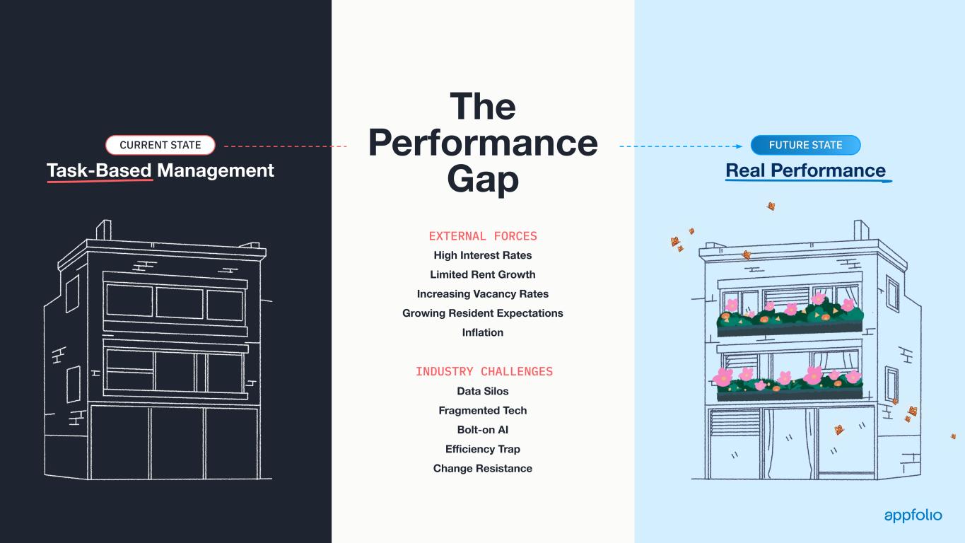 EXTERNAL FORCES Task-Based Management High Interest Rates Limited Rent Growth Increasing Vacancy Rates Growing Resident Expectations Inflation Data Silos Fragmented Tech Bolt-on AI Efficiency Trap Change Resistance INDUSTRY CHALLENGES CURRENT STATE