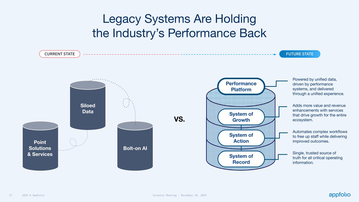 17 2025 © AppFolio Investor Meeting - November 18, 2025 Legacy Systems Are Holding the Industry’s Performance Back VS. Siloed Data Bolt-on AI FUTURE STATE