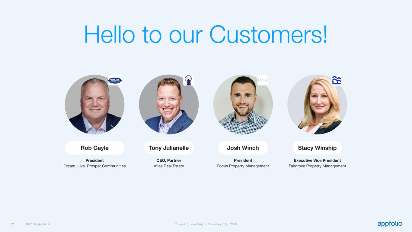 57 2025 © AppFolio Investor Meeting - November 18, 2025 Hello to our Customers! Rob Gayle President Dream. Live. Prosper Communities Josh Winch President Focus Property Management Stacy Winship Executive Vice President Fairgrove Property Management Tony Julianelle CEO, Partner Atlas Real Estate