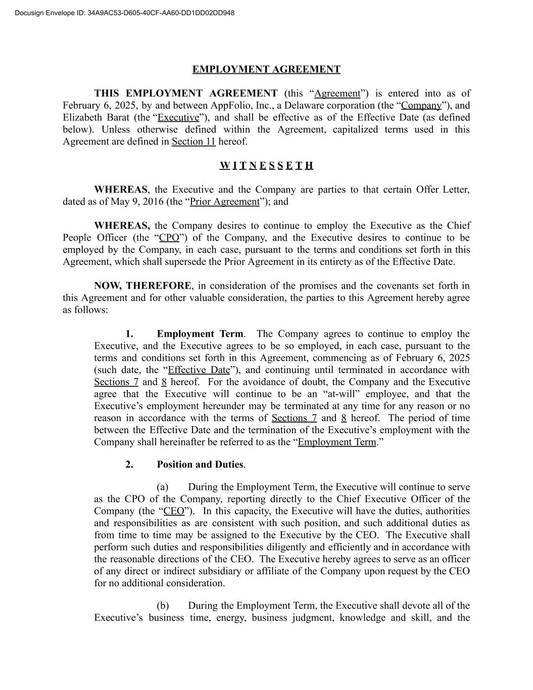 EMPLOYMENT AGREEMENT THIS EMPLOYMENT AGREEMENT (this “Agreement”) is entered into as of February 6, 2025, by and between AppFolio, Inc., a Delaware corporation (the “Company”), and Elizabeth Barat (the “Executive”), and shall be effective as of the Effective Date (as defined below). Unless otherwise defined within the Agreement, capitalized terms used in this Agreement are defined in Section 11 hereof. W I T N E S S E T H WHEREAS, the Executive and the Company are parties to that certain Offer Letter, dated as of May 9, 2016 (the “Prior Agreement”); and WHEREAS, the Company desires to continue to employ the Executive as the Chief People Officer (the “CPO”) of the Company, and the Executive desires to continue to be employed by the Company, in each case, pursuant to the terms and conditions set forth in this Agreement, which shall supersede the Prior Agreement in its entirety as of the Effective Date. NOW, THEREFORE, in consideration of the promises and the covenants set forth in this Agreement and for other valuable consideration, the parties to this Agreement hereby agree as follows: 1. Employment Term. The Company agrees to continue to employ the Executive, and the Executive agrees to be so employed, in each case, pursuant to the terms and conditions set forth in this Agreement, commencing as of February 6, 2025 (such date, the “Effective Date”), and continuing until terminated in accordance with Sections 7 and 8 hereof. For the avoidance of doubt, the Company and the Executive agree that the Executive will continue to be an “at-will” employee, and that the Executive’s employment hereunder may be terminated at any time for any reason or no reason in accordance with the terms of Sections 7 and 8 hereof. The period of time between the Effective Date and the termination of the Executive’s employment with the Company shall hereinafter be referred to as the “Employment Term.” 2. Position and Duties. (a) During the Employment Term, the Executive will continue to serve as the CPO of the Company, reporting directly to the Chief Executive Officer of the Company (the “CEO”). In this capacity, the Executive will have the duties, authorities and responsibilities as are consistent with such position, and such additional duties as from time to time may be assigned to the Executive by the CEO. The Executive shall perform such duties and responsibilities diligently and efficiently and in accordance with the reasonable directions of the CEO. The Executive hereby agrees to serve as an officer of any direct or indirect subsidiary or affiliate of the Company upon request by the CEO for no additional consideration. (b) During the Employment Term, the Executive shall devote all of the Executive’s business time, energy, business judgment, knowledge and skill, and the Docusign Envelope ID: 34A9AC53-D605-40CF-AA60-DD1DD02DD948