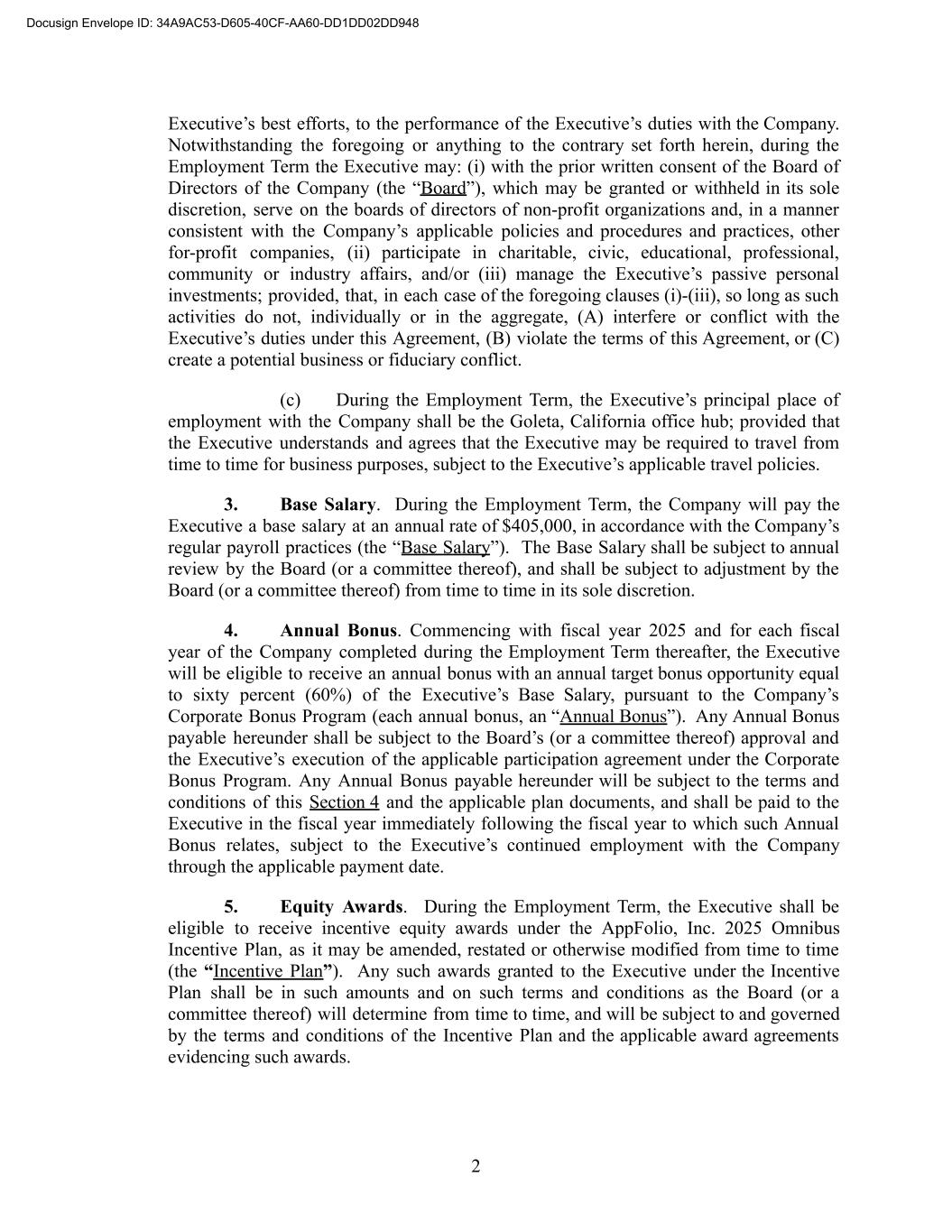 Executive’s best efforts, to the performance of the Executive’s duties with the Company. Notwithstanding the foregoing or anything to the contrary set forth herein, during the Employment Term the Executive may: (i) with the prior written consent of the Board of Directors of the Company (the “Board”), which may be granted or withheld in its sole discretion, serve on the boards of directors of non-profit organizations and, in a manner consistent with the Company’s applicable policies and procedures and practices, other for-profit companies, (ii) participate in charitable, civic, educational, professional, community or industry affairs, and/or (iii) manage the Executive’s passive personal investments; provided, that, in each case of the foregoing clauses (i)-(iii), so long as such activities do not, individually or in the aggregate, (A) interfere or conflict with the Executive’s duties under this Agreement, (B) violate the terms of this Agreement, or (C) create a potential business or fiduciary conflict. (c) During the Employment Term, the Executive’s principal place of employment with the Company shall be the Goleta, California office hub; provided that the Executive understands and agrees that the Executive may be required to travel from time to time for business purposes, subject to the Executive’s applicable travel policies. 3. Base Salary. During the Employment Term, the Company will pay the Executive a base salary at an annual rate of $405,000, in accordance with the Company’s regular payroll practices (the “Base Salary”). The Base Salary shall be subject to annual review by the Board (or a committee thereof), and shall be subject to adjustment by the Board (or a committee thereof) from time to time in its sole discretion. 4. Annual Bonus. Commencing with fiscal year 2025 and for each fiscal year of the Company completed during the Employment Term thereafter, the Executive will be eligible to receive an annual bonus with an annual target bonus opportunity equal to sixty percent (60%) of the Executive’s Base Salary, pursuant to the Company’s Corporate Bonus Program (each annual bonus, an “Annual Bonus”). Any Annual Bonus payable hereunder shall be subject to the Board’s (or a committee thereof) approval and the Executive’s execution of the applicable participation agreement under the Corporate Bonus Program. Any Annual Bonus payable hereunder will be subject to the terms and conditions of this Section 4 and the applicable plan documents, and shall be paid to the Executive in the fiscal year immediately following the fiscal year to which such Annual Bonus relates, subject to the Executive’s continued employment with the Company through the applicable payment date. 5. Equity Awards. During the Employment Term, the Executive shall be eligible to receive incentive equity awards under the AppFolio, Inc. 2025 Omnibus Incentive Plan, as it may be amended, restated or otherwise modified from time to time (the “Incentive Plan”). Any such awards granted to the Executive under the Incentive Plan shall be in such amounts and on such terms and conditions as the Board (or a committee thereof) will determine from time to time, and will be subject to and governed by the terms and conditions of the Incentive Plan and the applicable award agreements evidencing such awards. 2 Docusign Envelope ID: 34A9AC53-D605-40CF-AA60-DD1DD02DD948