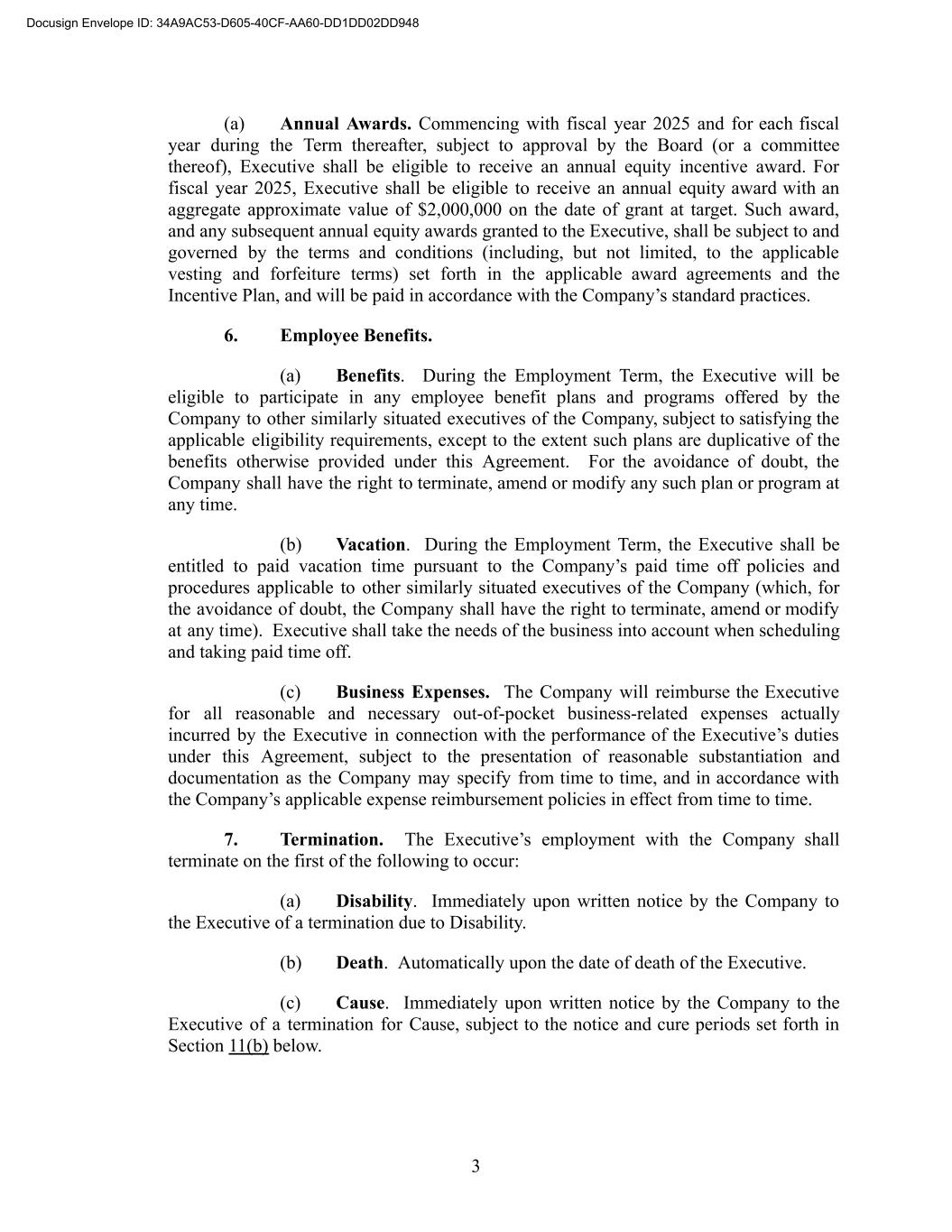 (a) Annual Awards. Commencing with fiscal year 2025 and for each fiscal year during the Term thereafter, subject to approval by the Board (or a committee thereof), Executive shall be eligible to receive an annual equity incentive award. For fiscal year 2025, Executive shall be eligible to receive an annual equity award with an aggregate approximate value of $2,000,000 on the date of grant at target. Such award, and any subsequent annual equity awards granted to the Executive, shall be subject to and governed by the terms and conditions (including, but not limited, to the applicable vesting and forfeiture terms) set forth in the applicable award agreements and the Incentive Plan, and will be paid in accordance with the Company’s standard practices. 6. Employee Benefits. (a) Benefits. During the Employment Term, the Executive will be eligible to participate in any employee benefit plans and programs offered by the Company to other similarly situated executives of the Company, subject to satisfying the applicable eligibility requirements, except to the extent such plans are duplicative of the benefits otherwise provided under this Agreement. For the avoidance of doubt, the Company shall have the right to terminate, amend or modify any such plan or program at any time. (b) Vacation. During the Employment Term, the Executive shall be entitled to paid vacation time pursuant to the Company’s paid time off policies and procedures applicable to other similarly situated executives of the Company (which, for the avoidance of doubt, the Company shall have the right to terminate, amend or modify at any time). Executive shall take the needs of the business into account when scheduling and taking paid time off. (c) Business Expenses. The Company will reimburse the Executive for all reasonable and necessary out-of-pocket business-related expenses actually incurred by the Executive in connection with the performance of the Executive’s duties under this Agreement, subject to the presentation of reasonable substantiation and documentation as the Company may specify from time to time, and in accordance with the Company’s applicable expense reimbursement policies in effect from time to time. 7. Termination. The Executive’s employment with the Company shall terminate on the first of the following to occur: (a) Disability. Immediately upon written notice by the Company to the Executive of a termination due to Disability. (b) Death. Automatically upon the date of death of the Executive. (c) Cause. Immediately upon written notice by the Company to the Executive of a termination for Cause, subject to the notice and cure periods set forth in Section 11(b) below. 3 Docusign Envelope ID: 34A9AC53-D605-40CF-AA60-DD1DD02DD948