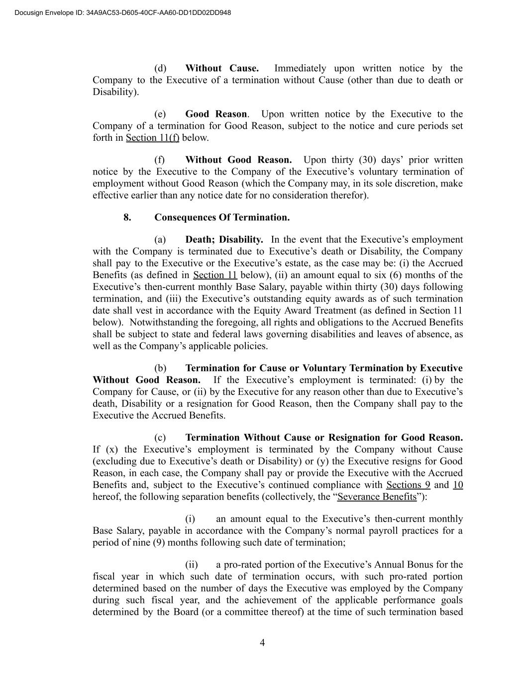 (d) Without Cause. Immediately upon written notice by the Company to the Executive of a termination without Cause (other than due to death or Disability). (e) Good Reason. Upon written notice by the Executive to the Company of a termination for Good Reason, subject to the notice and cure periods set forth in Section 11(f) below. (f) Without Good Reason. Upon thirty (30) days’ prior written notice by the Executive to the Company of the Executive’s voluntary termination of employment without Good Reason (which the Company may, in its sole discretion, make effective earlier than any notice date for no consideration therefor). 8. Consequences Of Termination. (a) Death; Disability. In the event that the Executive’s employment with the Company is terminated due to Executive’s death or Disability, the Company shall pay to the Executive or the Executive’s estate, as the case may be: (i) the Accrued Benefits (as defined in Section 11 below), (ii) an amount equal to six (6) months of the Executive’s then-current monthly Base Salary, payable within thirty (30) days following termination, and (iii) the Executive’s outstanding equity awards as of such termination date shall vest in accordance with the Equity Award Treatment (as defined in Section 11 below). Notwithstanding the foregoing, all rights and obligations to the Accrued Benefits shall be subject to state and federal laws governing disabilities and leaves of absence, as well as the Company’s applicable policies. (b) Termination for Cause or Voluntary Termination by Executive Without Good Reason. If the Executive’s employment is terminated: (i) by the Company for Cause, or (ii) by the Executive for any reason other than due to Executive’s death, Disability or a resignation for Good Reason, then the Company shall pay to the Executive the Accrued Benefits. (c) Termination Without Cause or Resignation for Good Reason. If (x) the Executive’s employment is terminated by the Company without Cause (excluding due to Executive’s death or Disability) or (y) the Executive resigns for Good Reason, in each case, the Company shall pay or provide the Executive with the Accrued Benefits and, subject to the Executive’s continued compliance with Sections 9 and 10 hereof, the following separation benefits (collectively, the “Severance Benefits”): (i) an amount equal to the Executive’s then-current monthly Base Salary, payable in accordance with the Company’s normal payroll practices for a period of nine (9) months following such date of termination; (ii) a pro-rated portion of the Executive’s Annual Bonus for the fiscal year in which such date of termination occurs, with such pro-rated portion determined based on the number of days the Executive was employed by the Company during such fiscal year, and the achievement of the applicable performance goals determined by the Board (or a committee thereof) at the time of such termination based 4 Docusign Envelope ID: 34A9AC53-D605-40CF-AA60-DD1DD02DD948