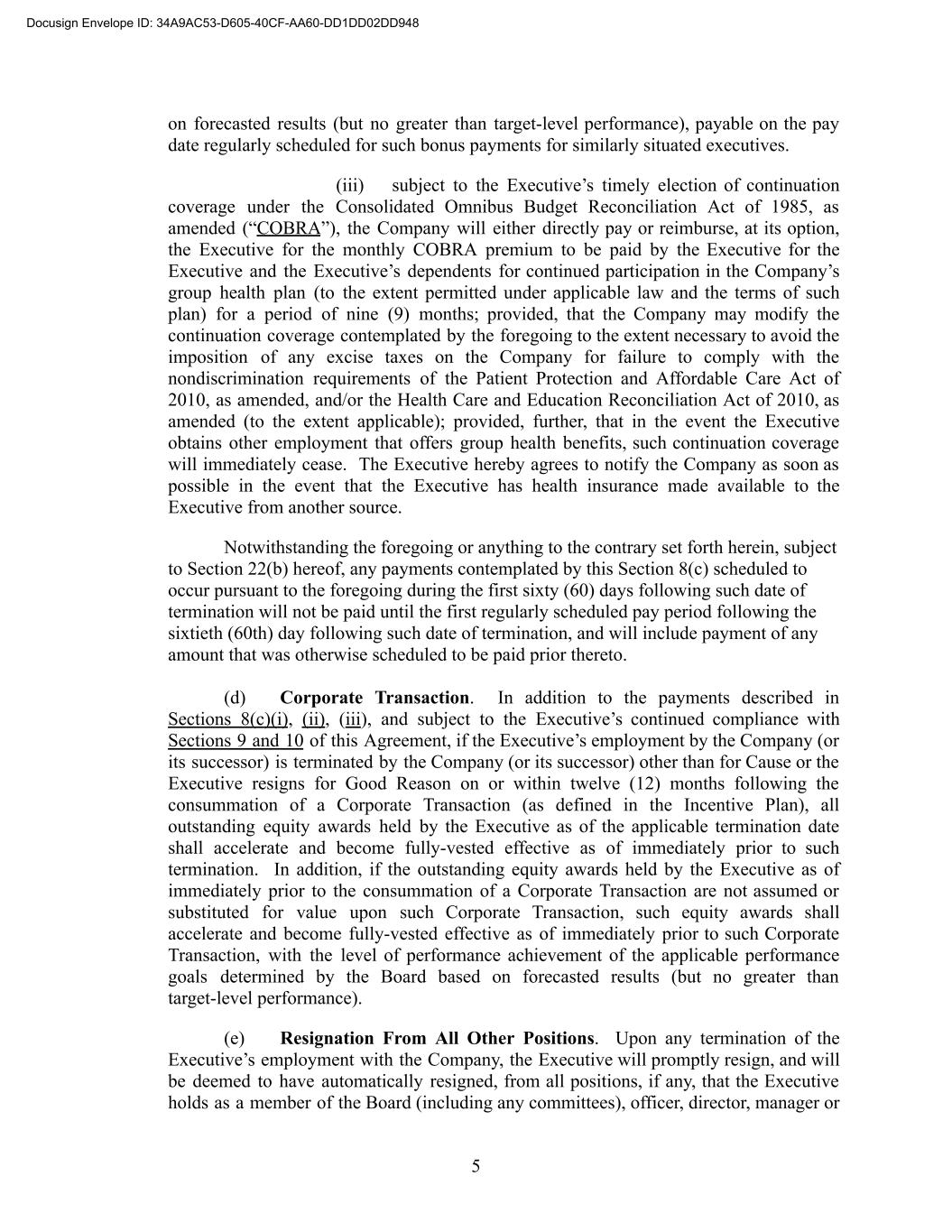on forecasted results (but no greater than target-level performance), payable on the pay date regularly scheduled for such bonus payments for similarly situated executives. (iii) subject to the Executive’s timely election of continuation coverage under the Consolidated Omnibus Budget Reconciliation Act of 1985, as amended (“COBRA”), the Company will either directly pay or reimburse, at its option, the Executive for the monthly COBRA premium to be paid by the Executive for the Executive and the Executive’s dependents for continued participation in the Company’s group health plan (to the extent permitted under applicable law and the terms of such plan) for a period of nine (9) months; provided, that the Company may modify the continuation coverage contemplated by the foregoing to the extent necessary to avoid the imposition of any excise taxes on the Company for failure to comply with the nondiscrimination requirements of the Patient Protection and Affordable Care Act of 2010, as amended, and/or the Health Care and Education Reconciliation Act of 2010, as amended (to the extent applicable); provided, further, that in the event the Executive obtains other employment that offers group health benefits, such continuation coverage will immediately cease. The Executive hereby agrees to notify the Company as soon as possible in the event that the Executive has health insurance made available to the Executive from another source. Notwithstanding the foregoing or anything to the contrary set forth herein, subject to Section 22(b) hereof, any payments contemplated by this Section 8(c) scheduled to occur pursuant to the foregoing during the first sixty (60) days following such date of termination will not be paid until the first regularly scheduled pay period following the sixtieth (60th) day following such date of termination, and will include payment of any amount that was otherwise scheduled to be paid prior thereto. (d) Corporate Transaction. In addition to the payments described in Sections 8(c)(i), (ii), (iii), and subject to the Executive’s continued compliance with Sections 9 and 10 of this Agreement, if the Executive’s employment by the Company (or its successor) is terminated by the Company (or its successor) other than for Cause or the Executive resigns for Good Reason on or within twelve (12) months following the consummation of a Corporate Transaction (as defined in the Incentive Plan), all outstanding equity awards held by the Executive as of the applicable termination date shall accelerate and become fully-vested effective as of immediately prior to such termination. In addition, if the outstanding equity awards held by the Executive as of immediately prior to the consummation of a Corporate Transaction are not assumed or substituted for value upon such Corporate Transaction, such equity awards shall accelerate and become fully-vested effective as of immediately prior to such Corporate Transaction, with the level of performance achievement of the applicable performance goals determined by the Board based on forecasted results (but no greater than target-level performance). (e) Resignation From All Other Positions. Upon any termination of the Executive’s employment with the Company, the Executive will promptly resign, and will be deemed to have automatically resigned, from all positions, if any, that the Executive holds as a member of the Board (including any committees), officer, director, manager or 5 Docusign Envelope ID: 34A9AC53-D605-40CF-AA60-DD1DD02DD948