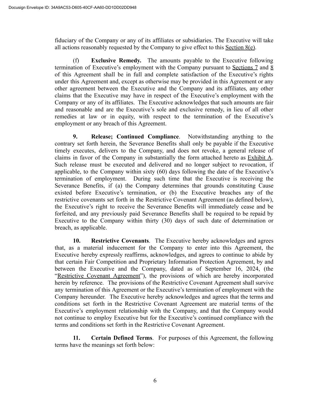 fiduciary of the Company or any of its affiliates or subsidiaries. The Executive will take all actions reasonably requested by the Company to give effect to this Section 8(e). (f) Exclusive Remedy. The amounts payable to the Executive following termination of Executive’s employment with the Company pursuant to Sections 7 and 8 of this Agreement shall be in full and complete satisfaction of the Executive’s rights under this Agreement and, except as otherwise may be provided in this Agreement or any other agreement between the Executive and the Company and its affiliates, any other claims that the Executive may have in respect of the Executive’s employment with the Company or any of its affiliates. The Executive acknowledges that such amounts are fair and reasonable and are the Executive’s sole and exclusive remedy, in lieu of all other remedies at law or in equity, with respect to the termination of the Executive’s employment or any breach of this Agreement. 9. Release; Continued Compliance. Notwithstanding anything to the contrary set forth herein, the Severance Benefits shall only be payable if the Executive timely executes, delivers to the Company, and does not revoke, a general release of claims in favor of the Company in substantially the form attached hereto as Exhibit A. Such release must be executed and delivered and no longer subject to revocation, if applicable, to the Company within sixty (60) days following the date of the Executive’s termination of employment. During such time that the Executive is receiving the Severance Benefits, if (a) the Company determines that grounds constituting Cause existed before Executive’s termination, or (b) the Executive breaches any of the restrictive covenants set forth in the Restrictive Covenant Agreement (as defined below), the Executive’s right to receive the Severance Benefits will immediately cease and be forfeited, and any previously paid Severance Benefits shall be required to be repaid by Executive to the Company within thirty (30) days of such date of determination or breach, as applicable. 10. Restrictive Covenants. The Executive hereby acknowledges and agrees that, as a material inducement for the Company to enter into this Agreement, the Executive hereby expressly reaffirms, acknowledges, and agrees to continue to abide by that certain Fair Competition and Proprietary Information Protection Agreement, by and between the Executive and the Company, dated as of September 16, 2024, (the “Restrictive Covenant Agreement”), the provisions of which are hereby incorporated herein by reference. The provisions of the Restrictive Covenant Agreement shall survive any termination of this Agreement or the Executive’s termination of employment with the Company hereunder. The Executive hereby acknowledges and agrees that the terms and conditions set forth in the Restrictive Covenant Agreement are material terms of the Executive’s employment relationship with the Company, and that the Company would not continue to employ Executive but for the Executive’s continued compliance with the terms and conditions set forth in the Restrictive Covenant Agreement. 11. Certain Defined Terms. For purposes of this Agreement, the following terms have the meanings set forth below: 6 Docusign Envelope ID: 34A9AC53-D605-40CF-AA60-DD1DD02DD948