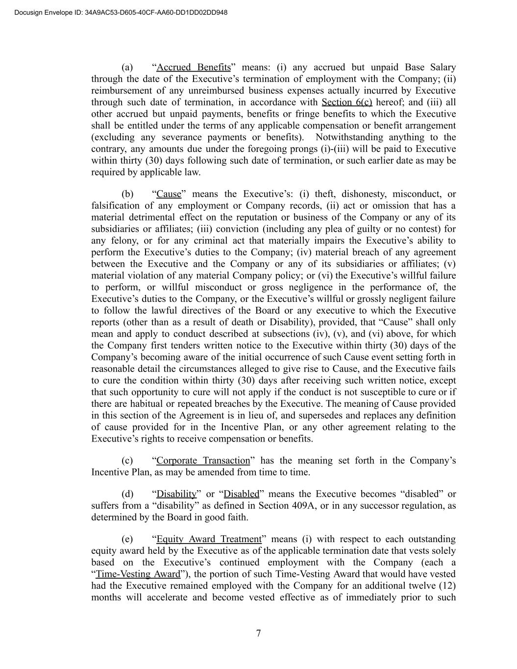 (a) “Accrued Benefits” means: (i) any accrued but unpaid Base Salary through the date of the Executive’s termination of employment with the Company; (ii) reimbursement of any unreimbursed business expenses actually incurred by Executive through such date of termination, in accordance with Section 6(c) hereof; and (iii) all other accrued but unpaid payments, benefits or fringe benefits to which the Executive shall be entitled under the terms of any applicable compensation or benefit arrangement (excluding any severance payments or benefits). Notwithstanding anything to the contrary, any amounts due under the foregoing prongs (i)-(iii) will be paid to Executive within thirty (30) days following such date of termination, or such earlier date as may be required by applicable law. (b) “Cause” means the Executive’s: (i) theft, dishonesty, misconduct, or falsification of any employment or Company records, (ii) act or omission that has a material detrimental effect on the reputation or business of the Company or any of its subsidiaries or affiliates; (iii) conviction (including any plea of guilty or no contest) for any felony, or for any criminal act that materially impairs the Executive’s ability to perform the Executive’s duties to the Company; (iv) material breach of any agreement between the Executive and the Company or any of its subsidiaries or affiliates; (v) material violation of any material Company policy; or (vi) the Executive’s willful failure to perform, or willful misconduct or gross negligence in the performance of, the Executive’s duties to the Company, or the Executive’s willful or grossly negligent failure to follow the lawful directives of the Board or any executive to which the Executive reports (other than as a result of death or Disability), provided, that “Cause” shall only mean and apply to conduct described at subsections (iv), (v), and (vi) above, for which the Company first tenders written notice to the Executive within thirty (30) days of the Company’s becoming aware of the initial occurrence of such Cause event setting forth in reasonable detail the circumstances alleged to give rise to Cause, and the Executive fails to cure the condition within thirty (30) days after receiving such written notice, except that such opportunity to cure will not apply if the conduct is not susceptible to cure or if there are habitual or repeated breaches by the Executive. The meaning of Cause provided in this section of the Agreement is in lieu of, and supersedes and replaces any definition of cause provided for in the Incentive Plan, or any other agreement relating to the Executive’s rights to receive compensation or benefits. (c) “Corporate Transaction” has the meaning set forth in the Company’s Incentive Plan, as may be amended from time to time. (d) “Disability” or “Disabled” means the Executive becomes “disabled” or suffers from a “disability” as defined in Section 409A, or in any successor regulation, as determined by the Board in good faith. (e) “Equity Award Treatment” means (i) with respect to each outstanding equity award held by the Executive as of the applicable termination date that vests solely based on the Executive’s continued employment with the Company (each a “Time-Vesting Award”), the portion of such Time-Vesting Award that would have vested had the Executive remained employed with the Company for an additional twelve (12) months will accelerate and become vested effective as of immediately prior to such 7 Docusign Envelope ID: 34A9AC53-D605-40CF-AA60-DD1DD02DD948