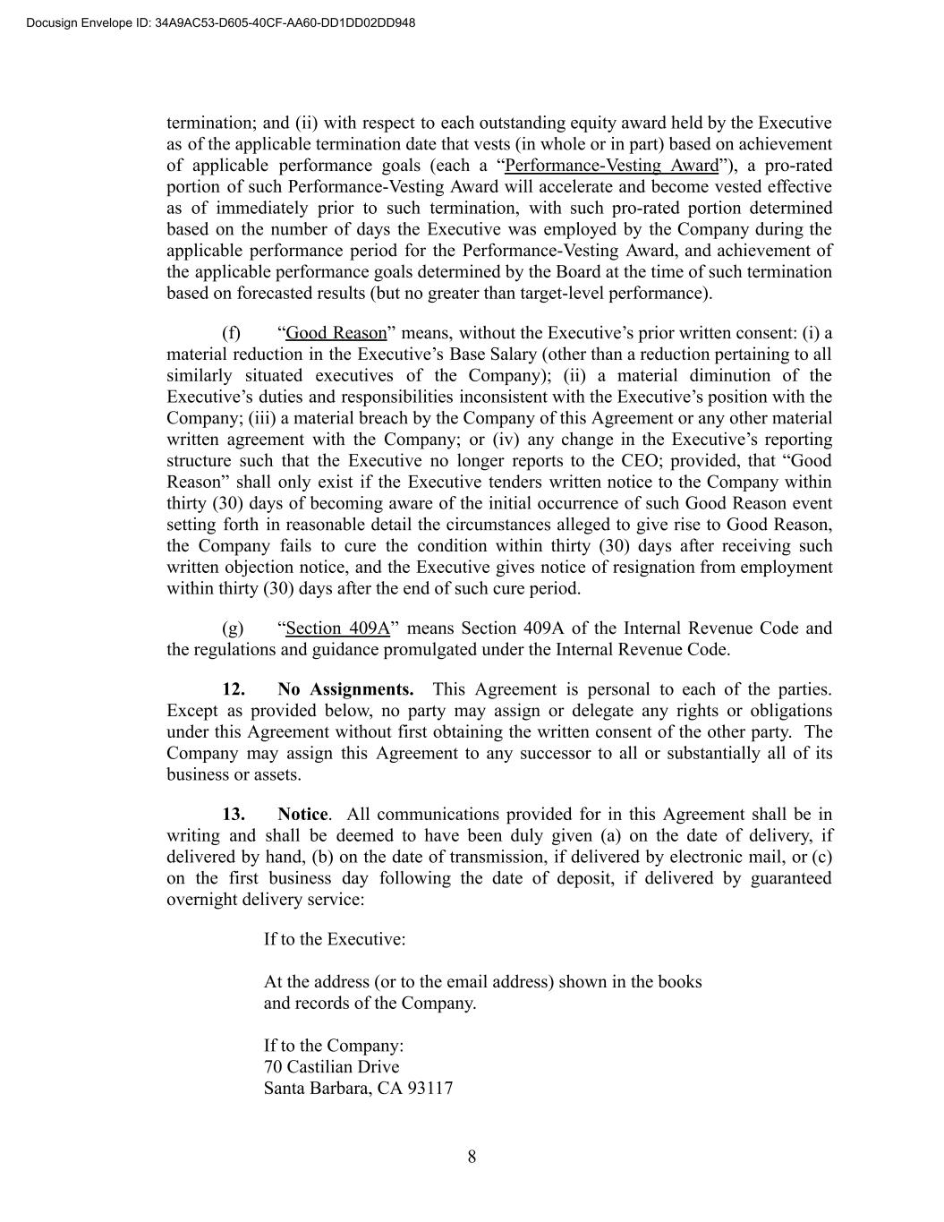 termination; and (ii) with respect to each outstanding equity award held by the Executive as of the applicable termination date that vests (in whole or in part) based on achievement of applicable performance goals (each a “Performance-Vesting Award”), a pro-rated portion of such Performance-Vesting Award will accelerate and become vested effective as of immediately prior to such termination, with such pro-rated portion determined based on the number of days the Executive was employed by the Company during the applicable performance period for the Performance-Vesting Award, and achievement of the applicable performance goals determined by the Board at the time of such termination based on forecasted results (but no greater than target-level performance). (f) “Good Reason” means, without the Executive’s prior written consent: (i) a material reduction in the Executive’s Base Salary (other than a reduction pertaining to all similarly situated executives of the Company); (ii) a material diminution of the Executive’s duties and responsibilities inconsistent with the Executive’s position with the Company; (iii) a material breach by the Company of this Agreement or any other material written agreement with the Company; or (iv) any change in the Executive’s reporting structure such that the Executive no longer reports to the CEO; provided, that “Good Reason” shall only exist if the Executive tenders written notice to the Company within thirty (30) days of becoming aware of the initial occurrence of such Good Reason event setting forth in reasonable detail the circumstances alleged to give rise to Good Reason, the Company fails to cure the condition within thirty (30) days after receiving such written objection notice, and the Executive gives notice of resignation from employment within thirty (30) days after the end of such cure period. (g) “Section 409A” means Section 409A of the Internal Revenue Code and the regulations and guidance promulgated under the Internal Revenue Code. 12. No Assignments. This Agreement is personal to each of the parties. Except as provided below, no party may assign or delegate any rights or obligations under this Agreement without first obtaining the written consent of the other party. The Company may assign this Agreement to any successor to all or substantially all of its business or assets. 13. Notice. All communications provided for in this Agreement shall be in writing and shall be deemed to have been duly given (a) on the date of delivery, if delivered by hand, (b) on the date of transmission, if delivered by electronic mail, or (c) on the first business day following the date of deposit, if delivered by guaranteed overnight delivery service: If to the Executive: At the address (or to the email address) shown in the books and records of the Company. If to the Company: 70 Castilian Drive Santa Barbara, CA 93117 8 Docusign Envelope ID: 34A9AC53-D605-40CF-AA60-DD1DD02DD948