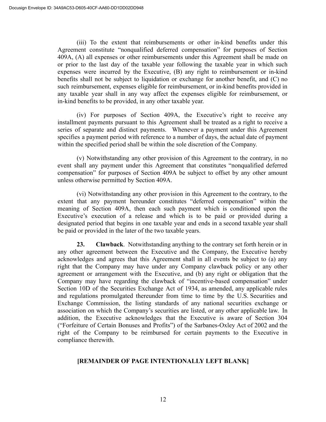 (iii) To the extent that reimbursements or other in-kind benefits under this Agreement constitute “nonqualified deferred compensation” for purposes of Section 409A, (A) all expenses or other reimbursements under this Agreement shall be made on or prior to the last day of the taxable year following the taxable year in which such expenses were incurred by the Executive, (B) any right to reimbursement or in-kind benefits shall not be subject to liquidation or exchange for another benefit, and (C) no such reimbursement, expenses eligible for reimbursement, or in-kind benefits provided in any taxable year shall in any way affect the expenses eligible for reimbursement, or in-kind benefits to be provided, in any other taxable year. (iv) For purposes of Section 409A, the Executive’s right to receive any installment payments pursuant to this Agreement shall be treated as a right to receive a series of separate and distinct payments. Whenever a payment under this Agreement specifies a payment period with reference to a number of days, the actual date of payment within the specified period shall be within the sole discretion of the Company. (v) Notwithstanding any other provision of this Agreement to the contrary, in no event shall any payment under this Agreement that constitutes “nonqualified deferred compensation” for purposes of Section 409A be subject to offset by any other amount unless otherwise permitted by Section 409A. (vi) Notwithstanding any other provision in this Agreement to the contrary, to the extent that any payment hereunder constitutes “deferred compensation” within the meaning of Section 409A, then each such payment which is conditioned upon the Executive’s execution of a release and which is to be paid or provided during a designated period that begins in one taxable year and ends in a second taxable year shall be paid or provided in the later of the two taxable years. 23. Clawback. Notwithstanding anything to the contrary set forth herein or in any other agreement between the Executive and the Company, the Executive hereby acknowledges and agrees that this Agreement shall in all events be subject to (a) any right that the Company may have under any Company clawback policy or any other agreement or arrangement with the Executive, and (b) any right or obligation that the Company may have regarding the clawback of “incentive-based compensation” under Section 10D of the Securities Exchange Act of 1934, as amended, any applicable rules and regulations promulgated thereunder from time to time by the U.S. Securities and Exchange Commission, the listing standards of any national securities exchange or association on which the Company’s securities are listed, or any other applicable law. In addition, the Executive acknowledges that the Executive is aware of Section 304 (“Forfeiture of Certain Bonuses and Profits”) of the Sarbanes-Oxley Act of 2002 and the right of the Company to be reimbursed for certain payments to the Executive in compliance therewith. [REMAINDER OF PAGE INTENTIONALLY LEFT BLANK] 12 Docusign Envelope ID: 34A9AC53-D605-40CF-AA60-DD1DD02DD948