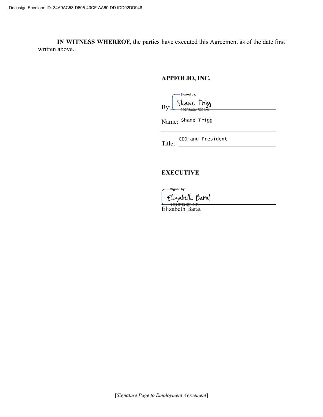 IN WITNESS WHEREOF, the parties have executed this Agreement as of the date first written above. [Signature Page to Employment Agreement] APPFOLIO, INC. By: Name: Title: EXECUTIVE Elizabeth Barat Docusign Envelope ID: 34A9AC53-D605-40CF-AA60-DD1DD02DD948 Shane Trigg CEO and President