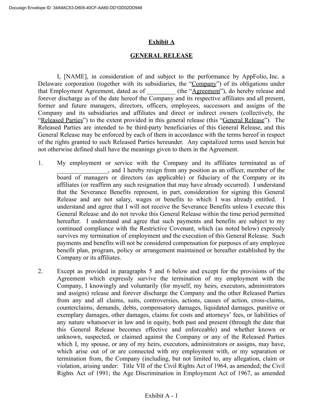 Exhibit A GENERAL RELEASE I, [NAME], in consideration of and subject to the performance by AppFolio, Inc. a Delaware corporation (together with its subsidiaries, the “Company”) of its obligations under that Employment Agreement, dated as of _________ (the “Agreement”), do hereby release and forever discharge as of the date hereof the Company and its respective affiliates and all present, former and future managers, directors, officers, employees, successors and assigns of the Company and its subsidiaries and affiliates and direct or indirect owners (collectively, the “Released Parties”) to the extent provided in this general release (this “General Release”). The Released Parties are intended to be third-party beneficiaries of this General Release, and this General Release may be enforced by each of them in accordance with the terms hereof in respect of the rights granted to such Released Parties hereunder. Any capitalized terms used herein but not otherwise defined shall have the meanings given to them in the Agreement. 1. My employment or service with the Company and its affiliates terminated as of ________________, and I hereby resign from any position as an officer, member of the board of managers or directors (as applicable) or fiduciary of the Company or its affiliates (or reaffirm any such resignation that may have already occurred). I understand that the Severance Benefits represent, in part, consideration for signing this General Release and are not salary, wages or benefits to which I was already entitled. I understand and agree that I will not receive the Severance Benefits unless I execute this General Release and do not revoke this General Release within the time period permitted hereafter. I understand and agree that such payments and benefits are subject to my continued compliance with the Restrictive Covenant, which (as noted below) expressly survives my termination of employment and the execution of this General Release. Such payments and benefits will not be considered compensation for purposes of any employee benefit plan, program, policy or arrangement maintained or hereafter established by the Company or its affiliates. 2. Except as provided in paragraphs 5 and 6 below and except for the provisions of the Agreement which expressly survive the termination of my employment with the Company, I knowingly and voluntarily (for myself, my heirs, executors, administrators and assigns) release and forever discharge the Company and the other Released Parties from any and all claims, suits, controversies, actions, causes of action, cross-claims, counterclaims, demands, debts, compensatory damages, liquidated damages, punitive or exemplary damages, other damages, claims for costs and attorneys’ fees, or liabilities of any nature whatsoever in law and in equity, both past and present (through the date that this General Release becomes effective and enforceable) and whether known or unknown, suspected, or claimed against the Company or any of the Released Parties which I, my spouse, or any of my heirs, executors, administrators or assigns, may have, which arise out of or are connected with my employment with, or my separation or termination from, the Company (including, but not limited to, any allegation, claim or violation, arising under: Title VII of the Civil Rights Act of 1964, as amended; the Civil Rights Act of 1991; the Age Discrimination in Employment Act of 1967, as amended Exhibit A - 1 Docusign Envelope ID: 34A9AC53-D605-40CF-AA60-DD1DD02DD948
