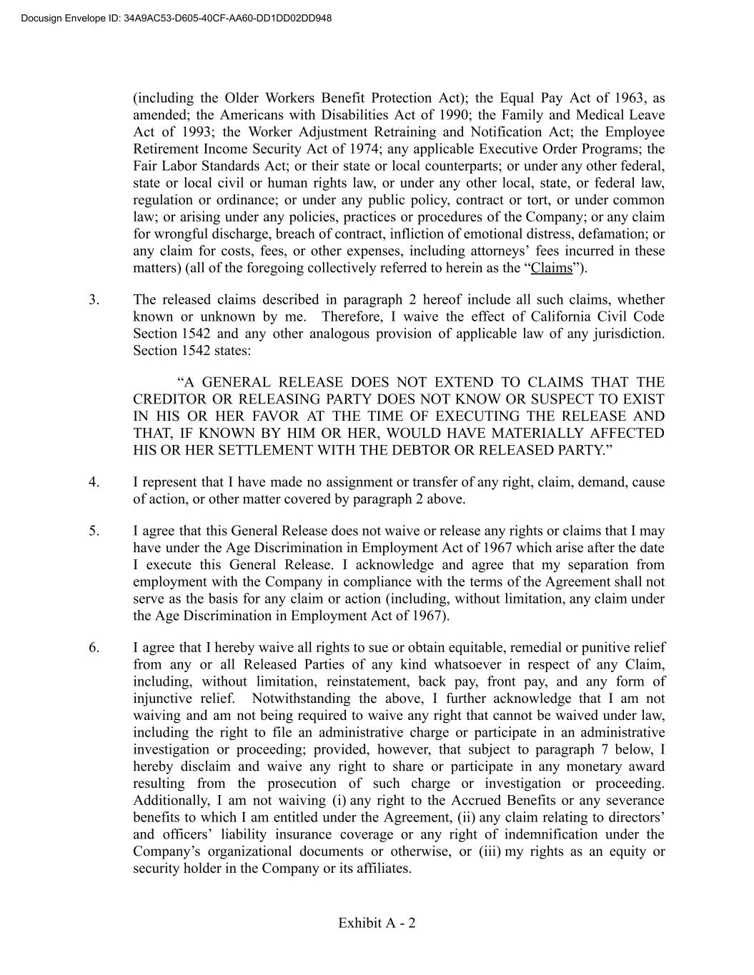 (including the Older Workers Benefit Protection Act); the Equal Pay Act of 1963, as amended; the Americans with Disabilities Act of 1990; the Family and Medical Leave Act of 1993; the Worker Adjustment Retraining and Notification Act; the Employee Retirement Income Security Act of 1974; any applicable Executive Order Programs; the Fair Labor Standards Act; or their state or local counterparts; or under any other federal, state or local civil or human rights law, or under any other local, state, or federal law, regulation or ordinance; or under any public policy, contract or tort, or under common law; or arising under any policies, practices or procedures of the Company; or any claim for wrongful discharge, breach of contract, infliction of emotional distress, defamation; or any claim for costs, fees, or other expenses, including attorneys’ fees incurred in these matters) (all of the foregoing collectively referred to herein as the “Claims”). 3. The released claims described in paragraph 2 hereof include all such claims, whether known or unknown by me. Therefore, I waive the effect of California Civil Code Section 1542 and any other analogous provision of applicable law of any jurisdiction. Section 1542 states: “A GENERAL RELEASE DOES NOT EXTEND TO CLAIMS THAT THE CREDITOR OR RELEASING PARTY DOES NOT KNOW OR SUSPECT TO EXIST IN HIS OR HER FAVOR AT THE TIME OF EXECUTING THE RELEASE AND THAT, IF KNOWN BY HIM OR HER, WOULD HAVE MATERIALLY AFFECTED HIS OR HER SETTLEMENT WITH THE DEBTOR OR RELEASED PARTY.” 4. I represent that I have made no assignment or transfer of any right, claim, demand, cause of action, or other matter covered by paragraph 2 above. 5. I agree that this General Release does not waive or release any rights or claims that I may have under the Age Discrimination in Employment Act of 1967 which arise after the date I execute this General Release. I acknowledge and agree that my separation from employment with the Company in compliance with the terms of the Agreement shall not serve as the basis for any claim or action (including, without limitation, any claim under the Age Discrimination in Employment Act of 1967). 6. I agree that I hereby waive all rights to sue or obtain equitable, remedial or punitive relief from any or all Released Parties of any kind whatsoever in respect of any Claim, including, without limitation, reinstatement, back pay, front pay, and any form of injunctive relief. Notwithstanding the above, I further acknowledge that I am not waiving and am not being required to waive any right that cannot be waived under law, including the right to file an administrative charge or participate in an administrative investigation or proceeding; provided, however, that subject to paragraph 7 below, I hereby disclaim and waive any right to share or participate in any monetary award resulting from the prosecution of such charge or investigation or proceeding. Additionally, I am not waiving (i) any right to the Accrued Benefits or any severance benefits to which I am entitled under the Agreement, (ii) any claim relating to directors’ and officers’ liability insurance coverage or any right of indemnification under the Company’s organizational documents or otherwise, or (iii) my rights as an equity or security holder in the Company or its affiliates. Exhibit A - 2 Docusign Envelope ID: 34A9AC53-D605-40CF-AA60-DD1DD02DD948