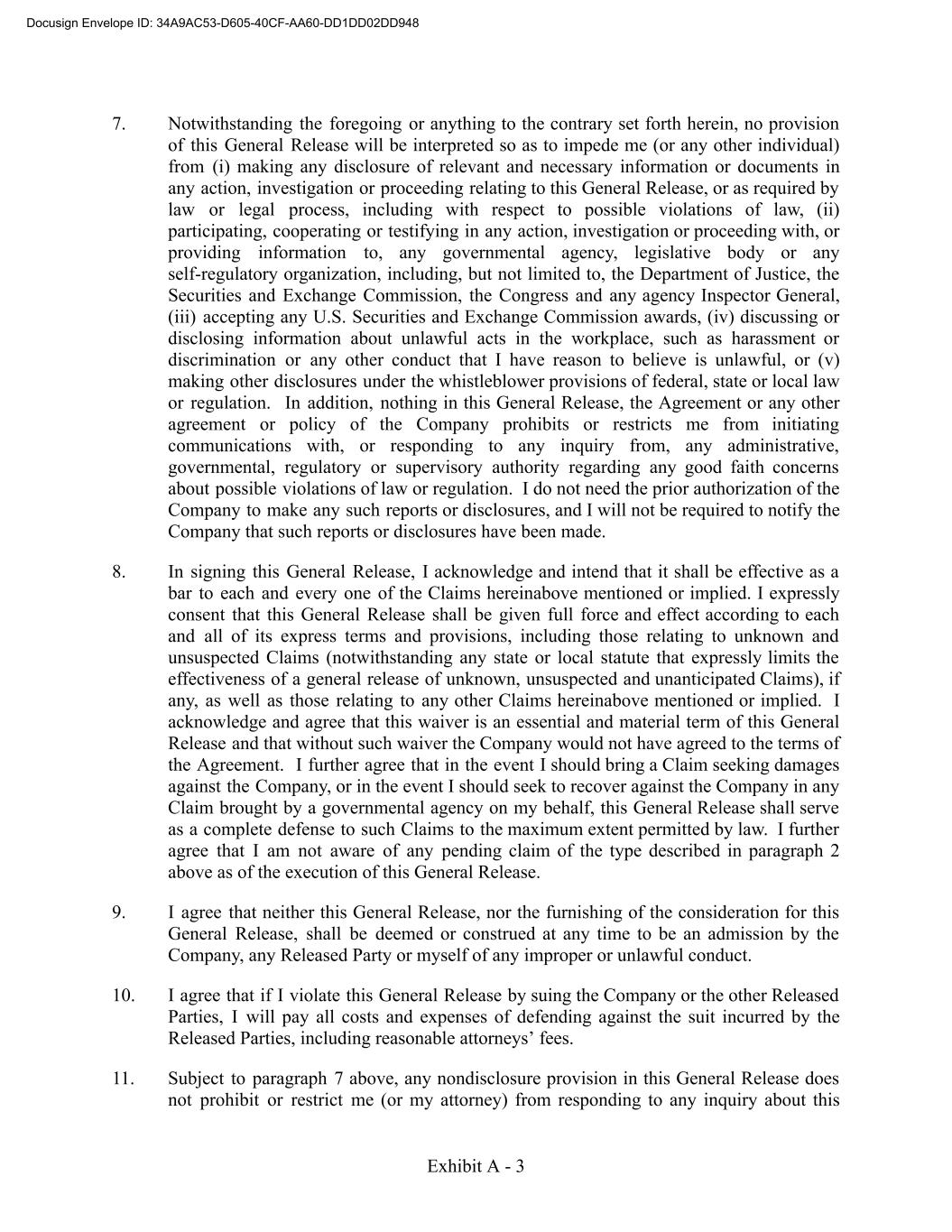 7. Notwithstanding the foregoing or anything to the contrary set forth herein, no provision of this General Release will be interpreted so as to impede me (or any other individual) from (i) making any disclosure of relevant and necessary information or documents in any action, investigation or proceeding relating to this General Release, or as required by law or legal process, including with respect to possible violations of law, (ii) participating, cooperating or testifying in any action, investigation or proceeding with, or providing information to, any governmental agency, legislative body or any self-regulatory organization, including, but not limited to, the Department of Justice, the Securities and Exchange Commission, the Congress and any agency Inspector General, (iii) accepting any U.S. Securities and Exchange Commission awards, (iv) discussing or disclosing information about unlawful acts in the workplace, such as harassment or discrimination or any other conduct that I have reason to believe is unlawful, or (v) making other disclosures under the whistleblower provisions of federal, state or local law or regulation. In addition, nothing in this General Release, the Agreement or any other agreement or policy of the Company prohibits or restricts me from initiating communications with, or responding to any inquiry from, any administrative, governmental, regulatory or supervisory authority regarding any good faith concerns about possible violations of law or regulation. I do not need the prior authorization of the Company to make any such reports or disclosures, and I will not be required to notify the Company that such reports or disclosures have been made. 8. In signing this General Release, I acknowledge and intend that it shall be effective as a bar to each and every one of the Claims hereinabove mentioned or implied. I expressly consent that this General Release shall be given full force and effect according to each and all of its express terms and provisions, including those relating to unknown and unsuspected Claims (notwithstanding any state or local statute that expressly limits the effectiveness of a general release of unknown, unsuspected and unanticipated Claims), if any, as well as those relating to any other Claims hereinabove mentioned or implied. I acknowledge and agree that this waiver is an essential and material term of this General Release and that without such waiver the Company would not have agreed to the terms of the Agreement. I further agree that in the event I should bring a Claim seeking damages against the Company, or in the event I should seek to recover against the Company in any Claim brought by a governmental agency on my behalf, this General Release shall serve as a complete defense to such Claims to the maximum extent permitted by law. I further agree that I am not aware of any pending claim of the type described in paragraph 2 above as of the execution of this General Release. 9. I agree that neither this General Release, nor the furnishing of the consideration for this General Release, shall be deemed or construed at any time to be an admission by the Company, any Released Party or myself of any improper or unlawful conduct. 10. I agree that if I violate this General Release by suing the Company or the other Released Parties, I will pay all costs and expenses of defending against the suit incurred by the Released Parties, including reasonable attorneys’ fees. 11. Subject to paragraph 7 above, any nondisclosure provision in this General Release does not prohibit or restrict me (or my attorney) from responding to any inquiry about this Exhibit A - 3 Docusign Envelope ID: 34A9AC53-D605-40CF-AA60-DD1DD02DD948