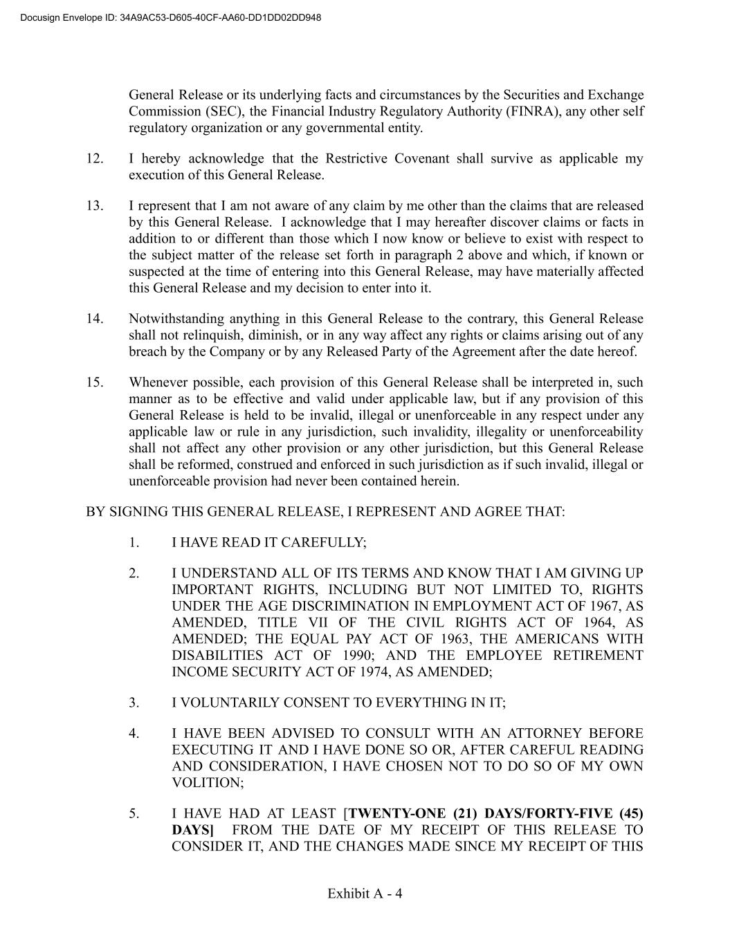 General Release or its underlying facts and circumstances by the Securities and Exchange Commission (SEC), the Financial Industry Regulatory Authority (FINRA), any other self regulatory organization or any governmental entity. 12. I hereby acknowledge that the Restrictive Covenant shall survive as applicable my execution of this General Release. 13. I represent that I am not aware of any claim by me other than the claims that are released by this General Release. I acknowledge that I may hereafter discover claims or facts in addition to or different than those which I now know or believe to exist with respect to the subject matter of the release set forth in paragraph 2 above and which, if known or suspected at the time of entering into this General Release, may have materially affected this General Release and my decision to enter into it. 14. Notwithstanding anything in this General Release to the contrary, this General Release shall not relinquish, diminish, or in any way affect any rights or claims arising out of any breach by the Company or by any Released Party of the Agreement after the date hereof. 15. Whenever possible, each provision of this General Release shall be interpreted in, such manner as to be effective and valid under applicable law, but if any provision of this General Release is held to be invalid, illegal or unenforceable in any respect under any applicable law or rule in any jurisdiction, such invalidity, illegality or unenforceability shall not affect any other provision or any other jurisdiction, but this General Release shall be reformed, construed and enforced in such jurisdiction as if such invalid, illegal or unenforceable provision had never been contained herein. BY SIGNING THIS GENERAL RELEASE, I REPRESENT AND AGREE THAT: 1. I HAVE READ IT CAREFULLY; 2. I UNDERSTAND ALL OF ITS TERMS AND KNOW THAT I AM GIVING UP IMPORTANT RIGHTS, INCLUDING BUT NOT LIMITED TO, RIGHTS UNDER THE AGE DISCRIMINATION IN EMPLOYMENT ACT OF 1967, AS AMENDED, TITLE VII OF THE CIVIL RIGHTS ACT OF 1964, AS AMENDED; THE EQUAL PAY ACT OF 1963, THE AMERICANS WITH DISABILITIES ACT OF 1990; AND THE EMPLOYEE RETIREMENT INCOME SECURITY ACT OF 1974, AS AMENDED; 3. I VOLUNTARILY CONSENT TO EVERYTHING IN IT; 4. I HAVE BEEN ADVISED TO CONSULT WITH AN ATTORNEY BEFORE EXECUTING IT AND I HAVE DONE SO OR, AFTER CAREFUL READING AND CONSIDERATION, I HAVE CHOSEN NOT TO DO SO OF MY OWN VOLITION; 5. I HAVE HAD AT LEAST [TWENTY-ONE (21) DAYS/FORTY-FIVE (45) DAYS] FROM THE DATE OF MY RECEIPT OF THIS RELEASE TO CONSIDER IT, AND THE CHANGES MADE SINCE MY RECEIPT OF THIS Exhibit A - 4 Docusign Envelope ID: 34A9AC53-D605-40CF-AA60-DD1DD02DD948
